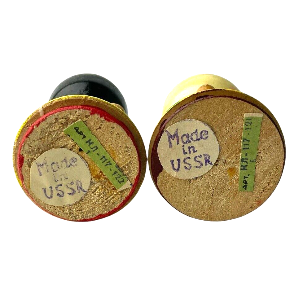 This is a vintage USSR figurine set of a girl and boy Russian wooden dolls, hand-painted and measuring 3.25" high. The dolls are intricately crafted and depict traditional Russian attire and designs. Perfect for collectors of decorative figurines or those interested in Russian culture and art.