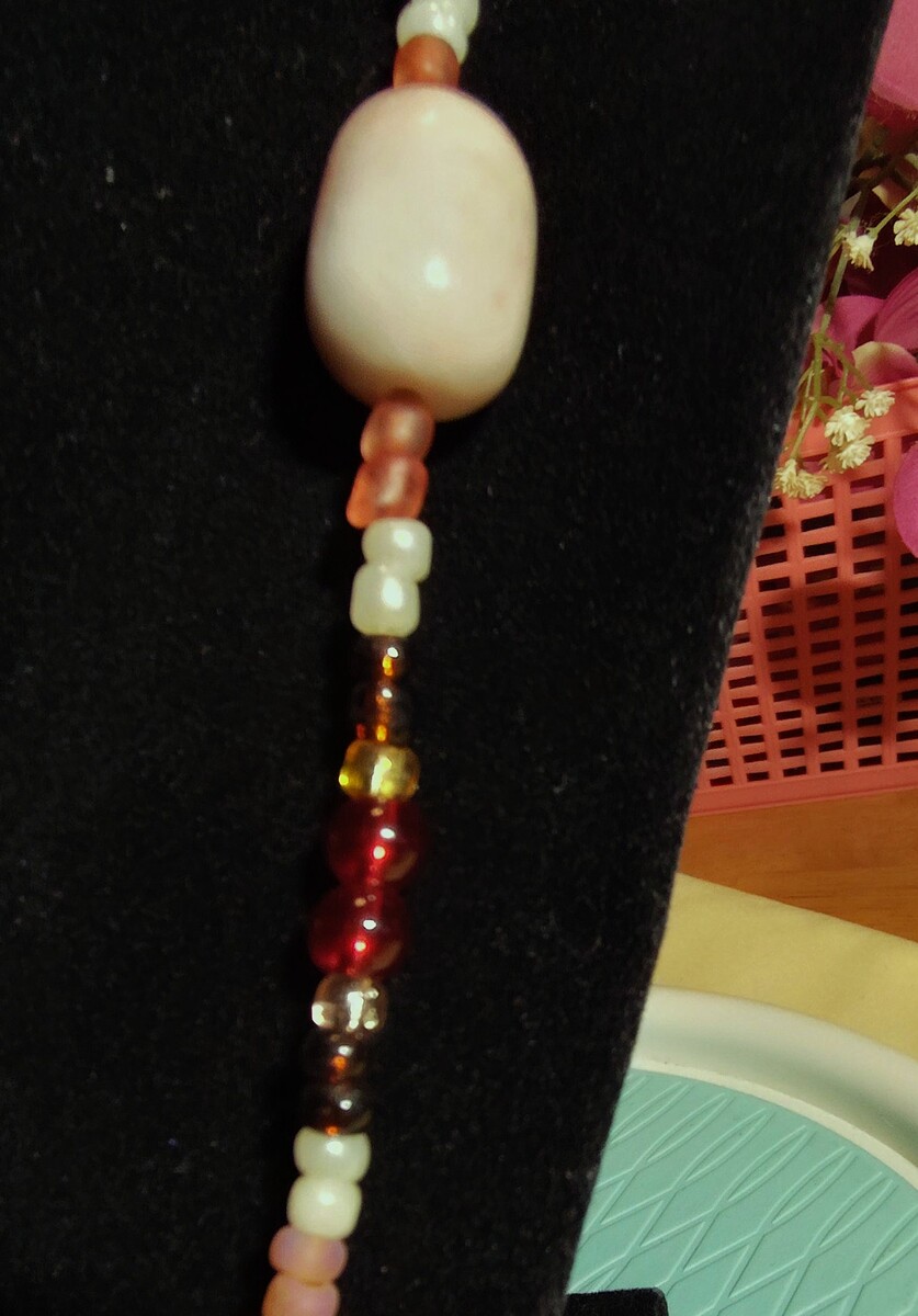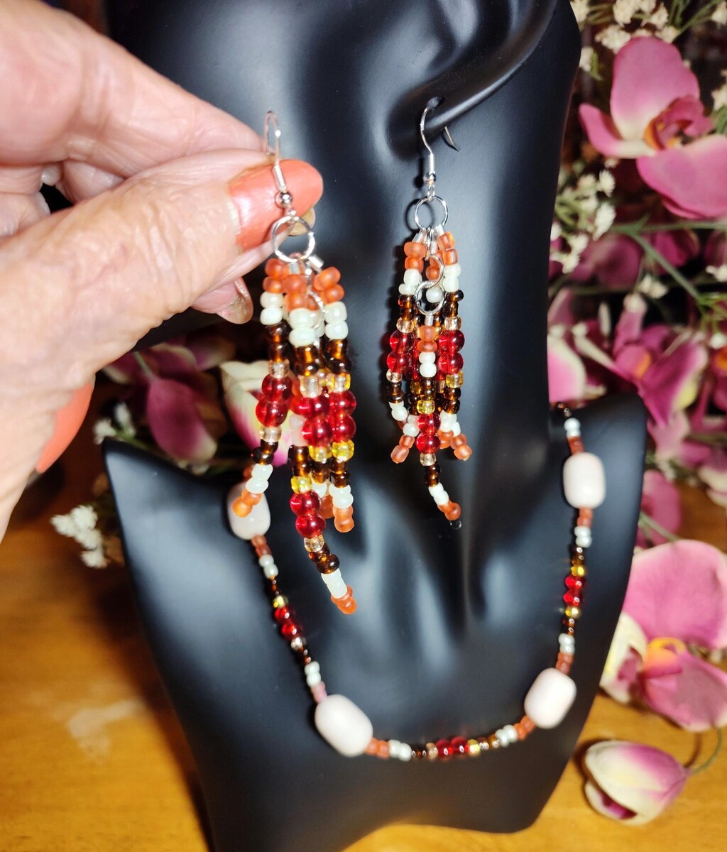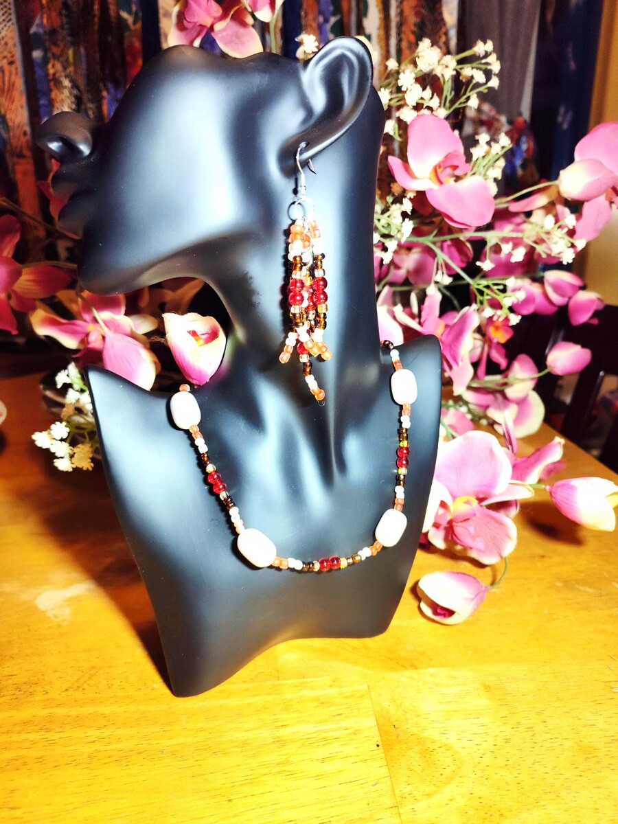 This beautifully handmade jewelry set features a striking 24” necklace with a large white ceramic cylinder bead and a bar-and-heart ring clasp, paired with matching 3.5” stainless steel dangling earrings. The necklace is artfully designed with vibrant Czech glass and seed beads in rich tones of red, pink, gold, white, and brown — a stunning balance of color and texture.