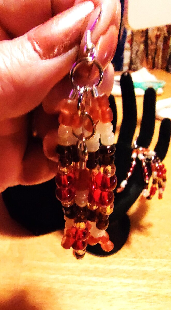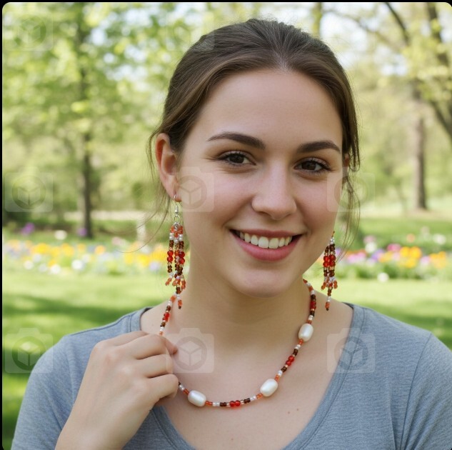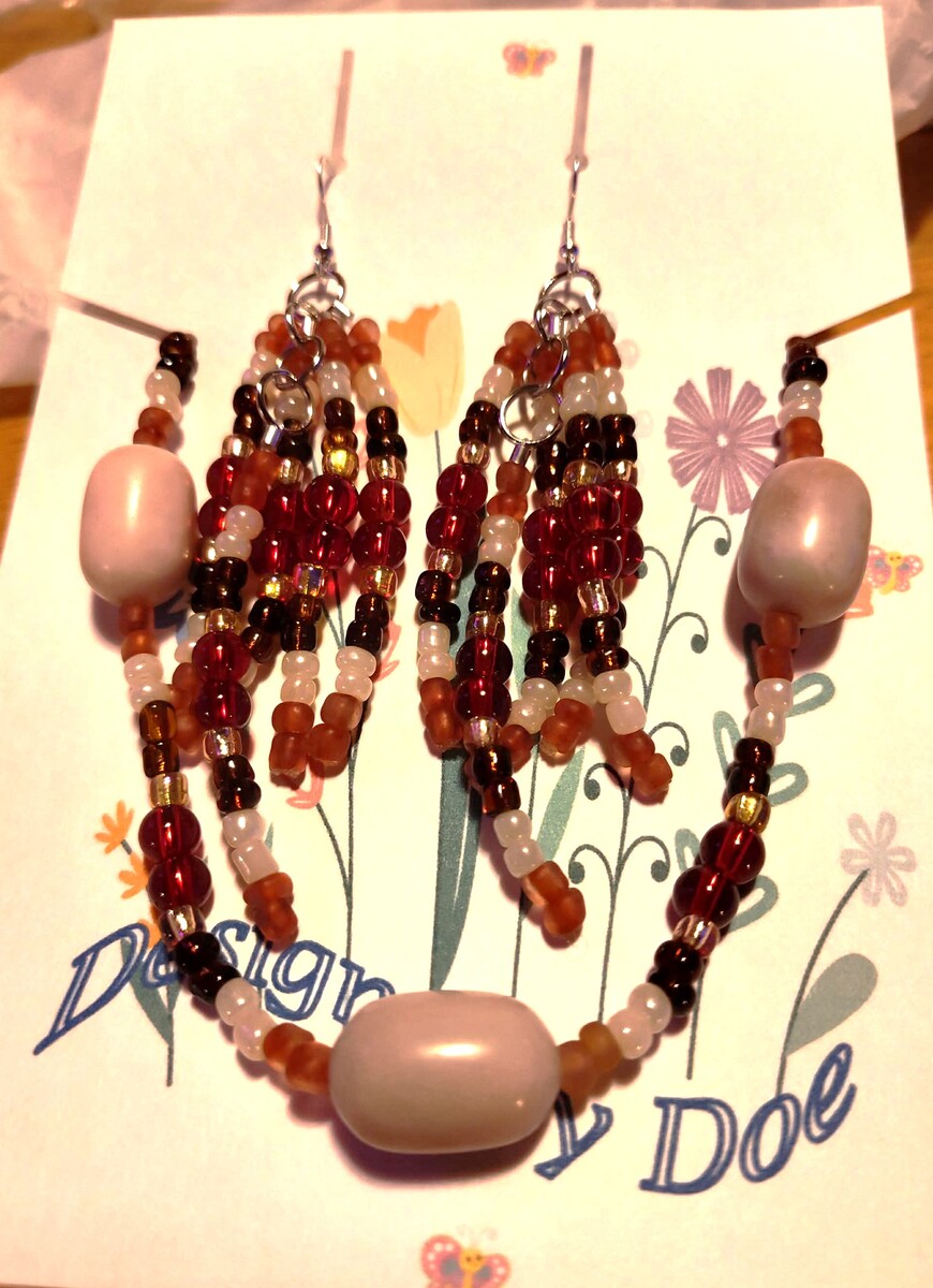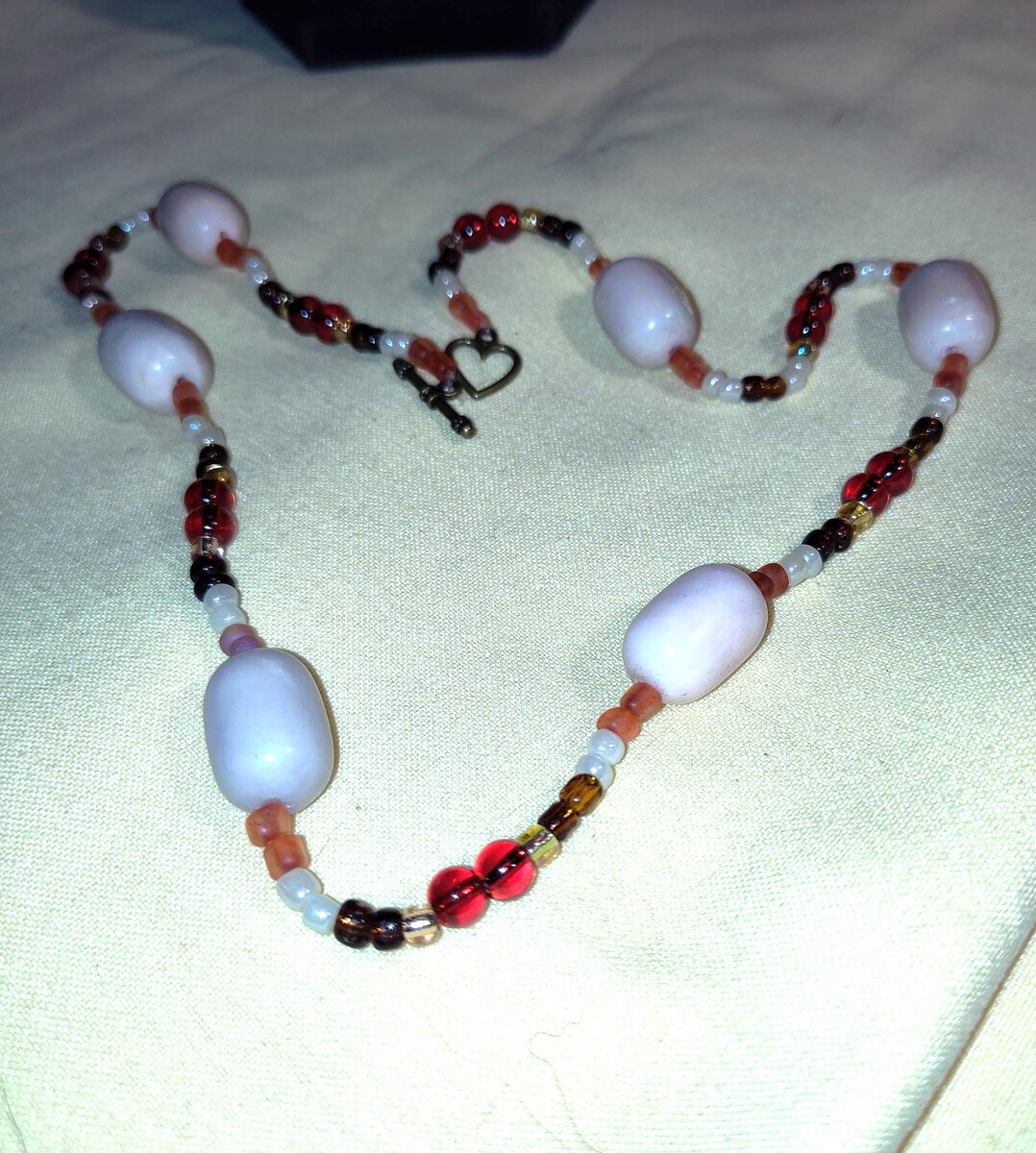 This beautifully handmade jewelry set features a striking 24” necklace with a large white ceramic cylinder bead and a bar-and-heart ring clasp, paired with matching 3.5” stainless steel dangling earrings. The necklace is artfully designed with vibrant Czech glass and seed beads in rich tones of red, pink, gold, white, and brown — a stunning balance of color and texture.