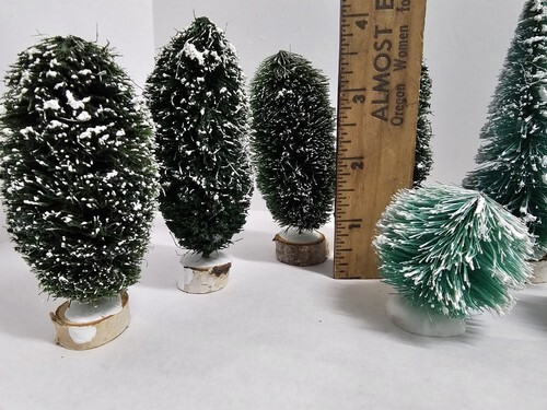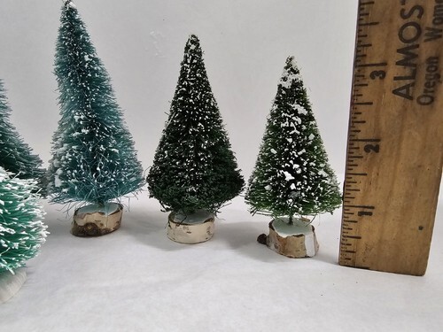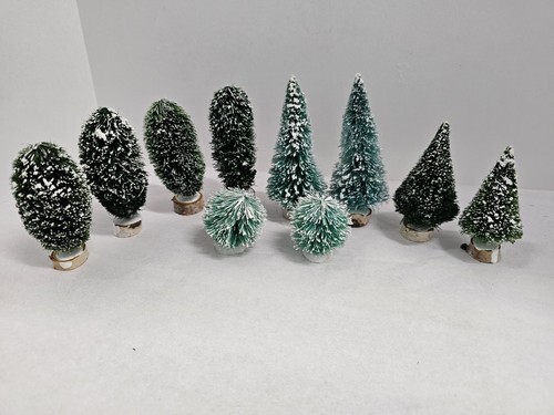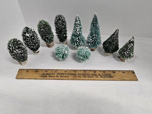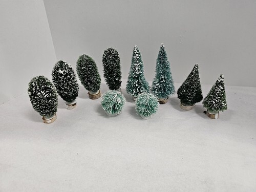 10 Vintage Bottle Brush Flocked Christmas Village Trees Frosted Snow Mixed Lot