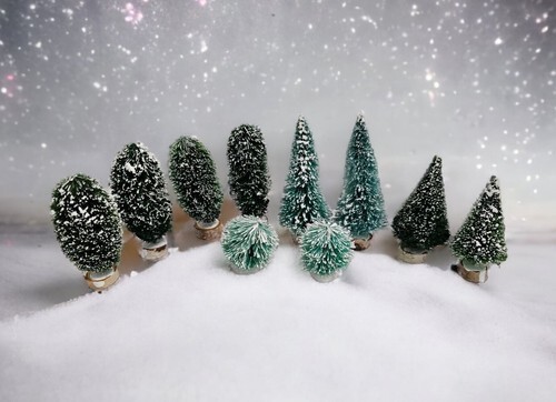 UP FOR SALE: 10 Vintage Bottle Brush Flocked Christmas Village Trees Frosted Snow Mixed Lot