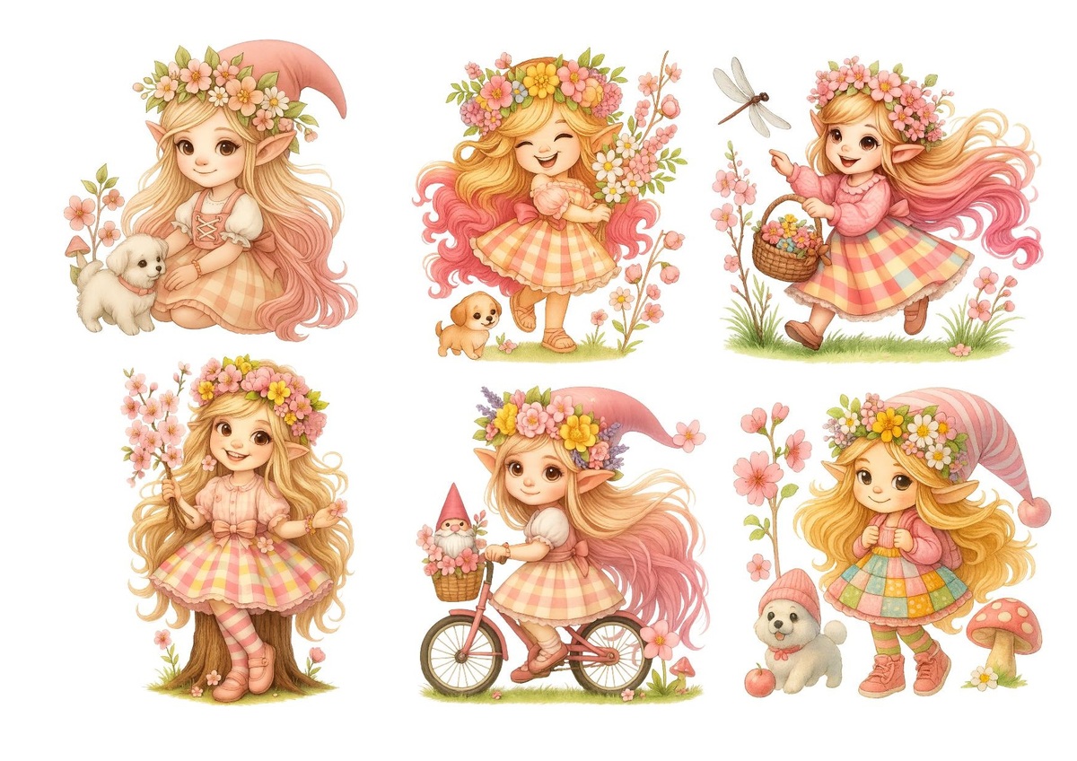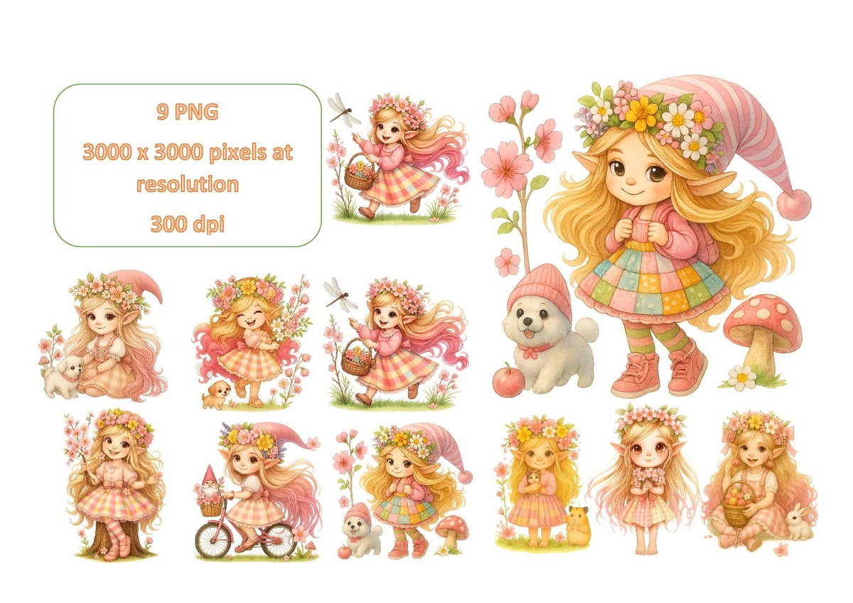 This set includes 9 high-quality PNG illustrations featuring adorable gnome girls (with a whimsical elf-like style), flower crowns, cute animals, and spring details. Perfect for sublimation, stickers, scrapbooking, cards, invitations, t-shirts, mugs, wall art, and more.