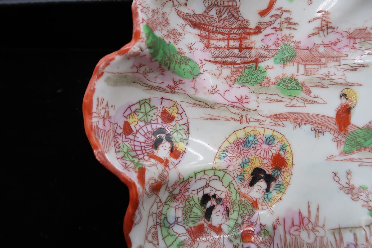 VTG Japanese Geisha Ware Moriage Nut Bowl Footed Scalloped Edge Handpainted