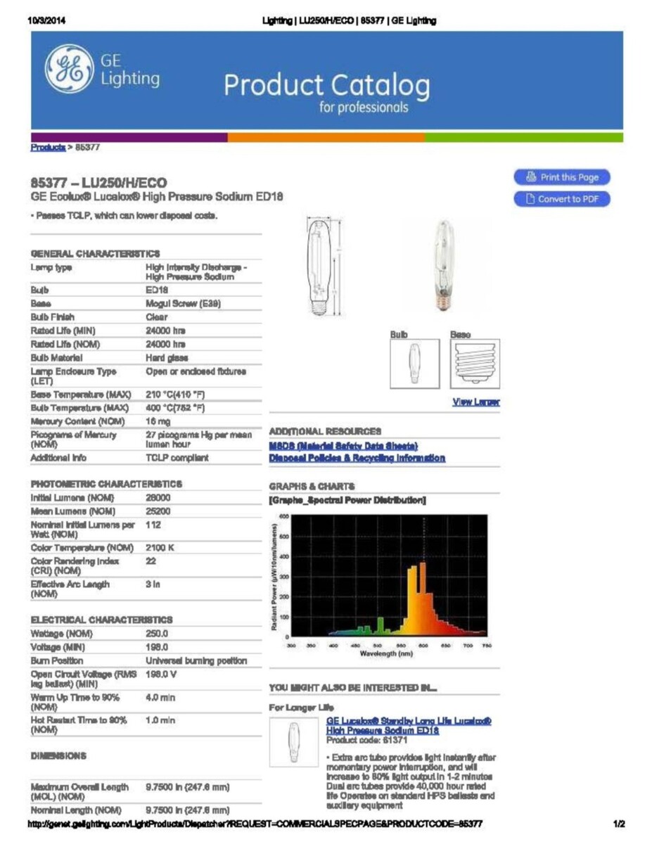 GE Ecolux Lucalox High Pressure Sodium ED18