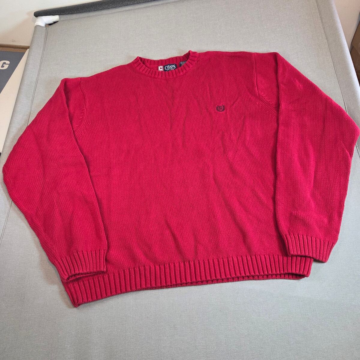 Vintage Chaps Ralph Lauren men?s cotton crewneck sweater in a bold red color. Made in Hong Kong during the 1990s, this midweight knit features the classic embroidered crest logo and ribbed trim throughout. Timeless preppy style with soft, breathable cotton fabric. Excellent vintage condition with no visible flaws.