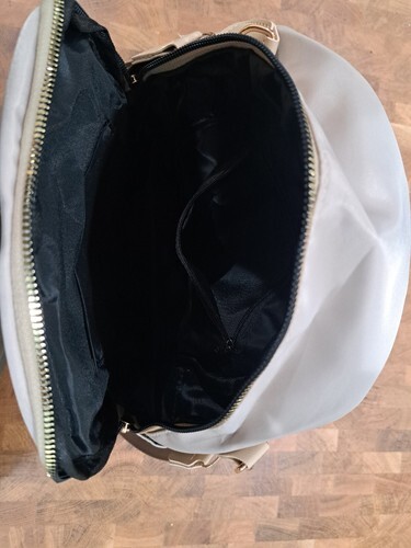 This minimalist creamy-white backpack is perfect for women who need a stylish and waterproof bag for their daily activities. The exterior is made of high-quality nylon with gold accents and embroidered details, giving it a sophisticated look. The bag has a zip closure and a small size that makes it easy to carry around.