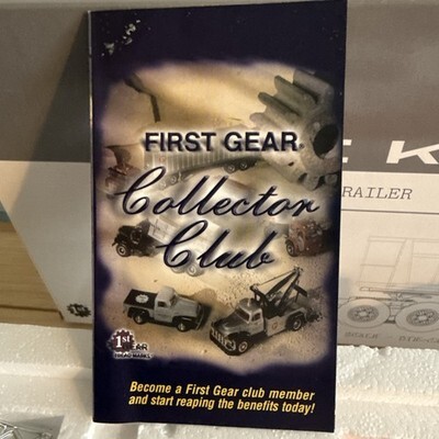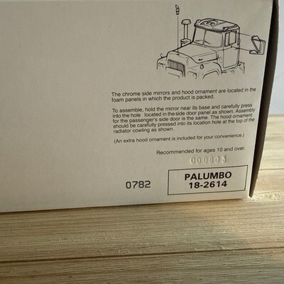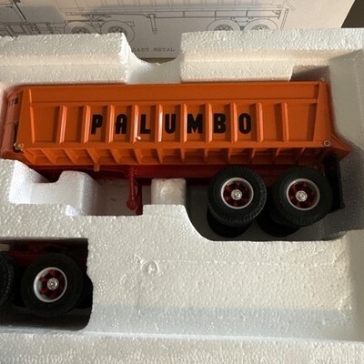 Brand-new, factory-sealed First Gear #18-2614 Mack R-Model day cab with matching dump trailer in rare Palumbo livery. 1/34 scale diecast metal, fully detailed: tilting hood, opening doors, chrome accents, working dump bed, rubber tires. Includes all original accessories, foam, and box sleeve. Never opened, never displayed ? true collector-grade MIB. Limited-run piece from the late 1990s. Perfect for Mack or construction model enthusiasts. Ships fast and secure!