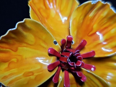 Striking vintage enamel flower brooch featuring bright yellow and orange petals with a bold red stamen center.