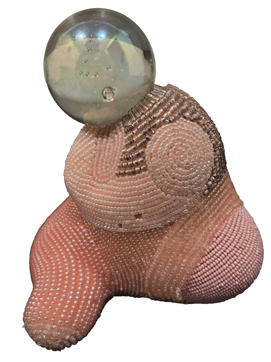 The product is a beautifully crafted beaded woman figurine statue sculpture, adorned with art glass balls. This decorative collectible is signed by the artist, adding a unique touch to its charm.