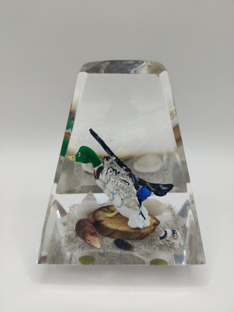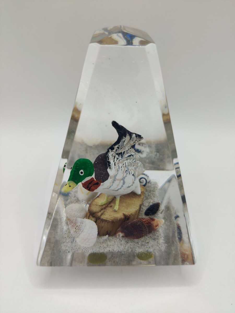 Vintage Mallard Duck In Clear Lucite Paperweight Hand Carved Seashells