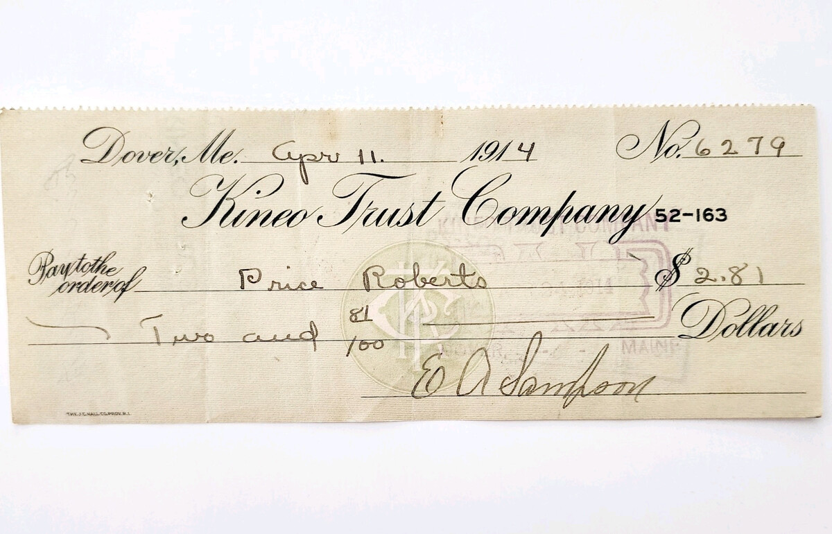 1914 Kineo Trust Company Bank Check E.A. Sampson Dover Maine Signed 6279 CHX11