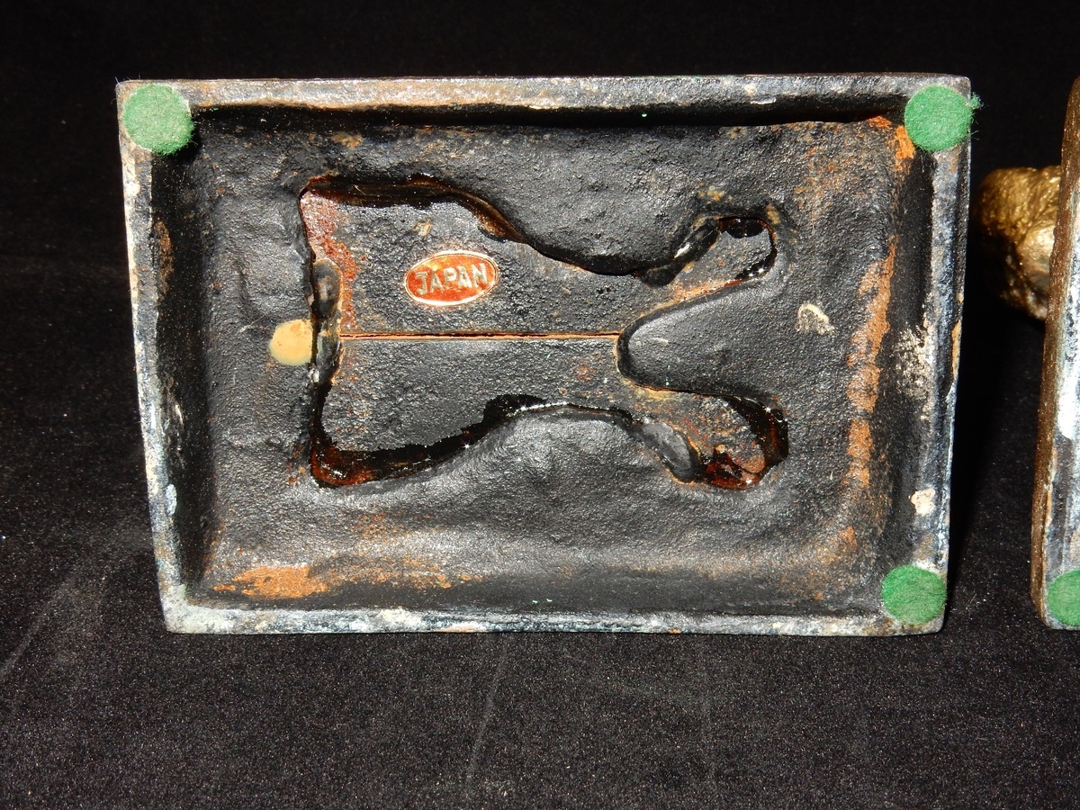 This is a pair of antique-style gold-colored cast iron elephant bookends or doorstops, made in Japan. The intricate design featuring elephants adds a unique touch to any space, making it a functional and decorative piece for a collector's display. The high-quality craftsmanship and original production of these bookends make them a standout addition to any collection of decorative items. These are heavy and measure approx. 5 1/2" tall.