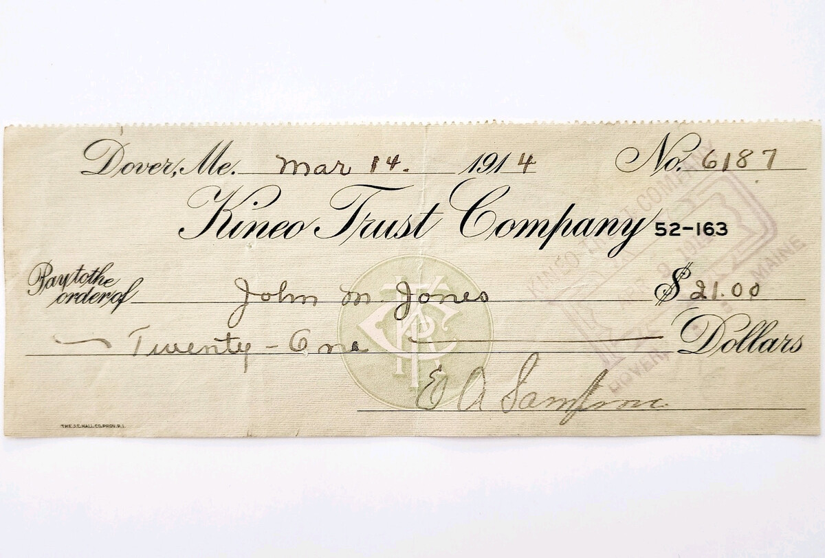 1914 Kineo Trust Company Bank Check E.A. Sampson Dover Maine Signed 6187 CHX12