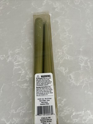 The product is a set of two Darice Premium Chartreuse Metallic 9.5" Tapered Candles. The candles are green in color and weigh 5 oz each. They are perfect for adding a touch of elegance to any home decor.