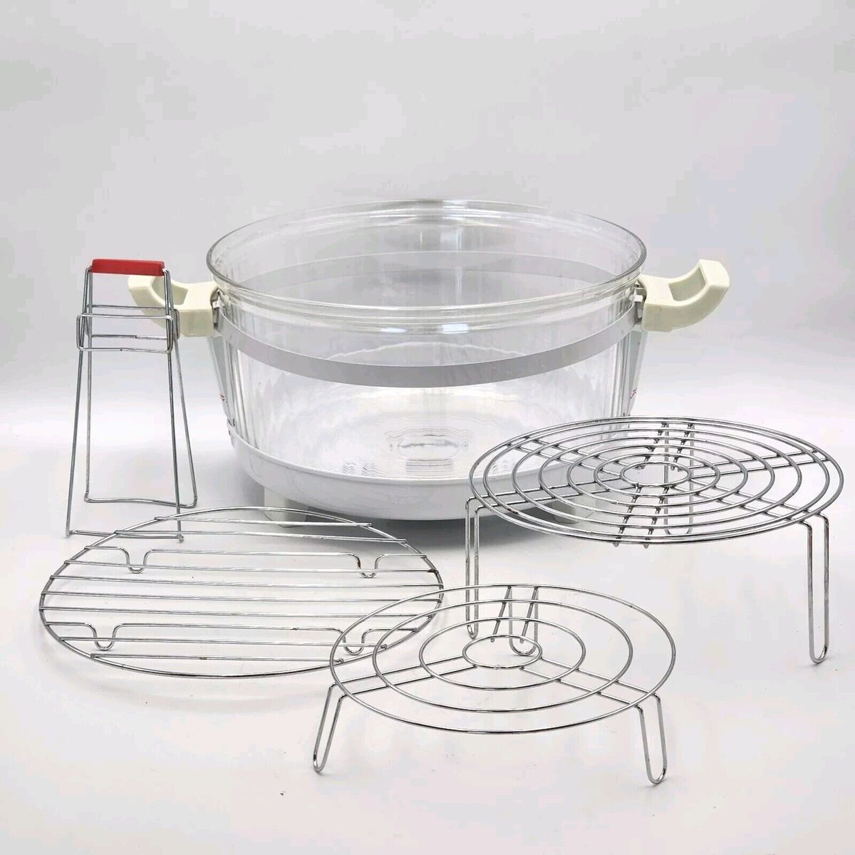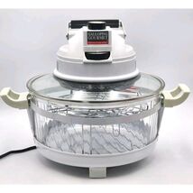Introducing the Galloping Gourmet AX707 Perfection-Aire Convection Oven, a top-of-the-line kitchen appliance perfect for any home cook. This electric oven is designed with a broil cooking method and a power source of 120V 60Hz 1440W. The oven is made with high-quality glass and metal materials and includes components such as a rack, lid, glass bowl, and base. Includes everything shown in photos.