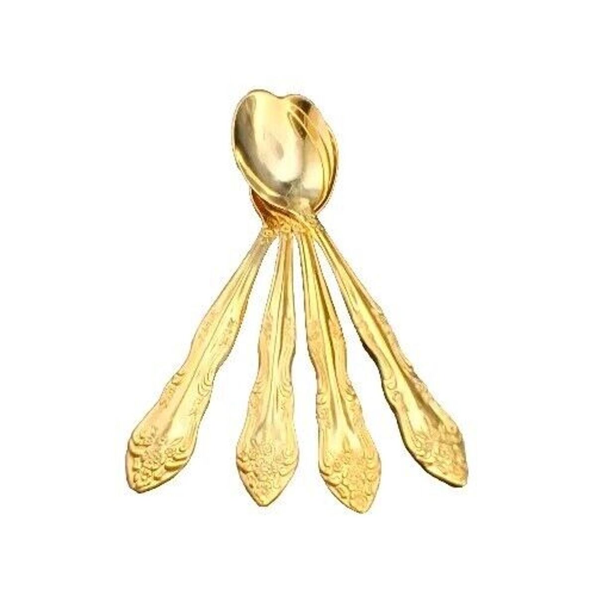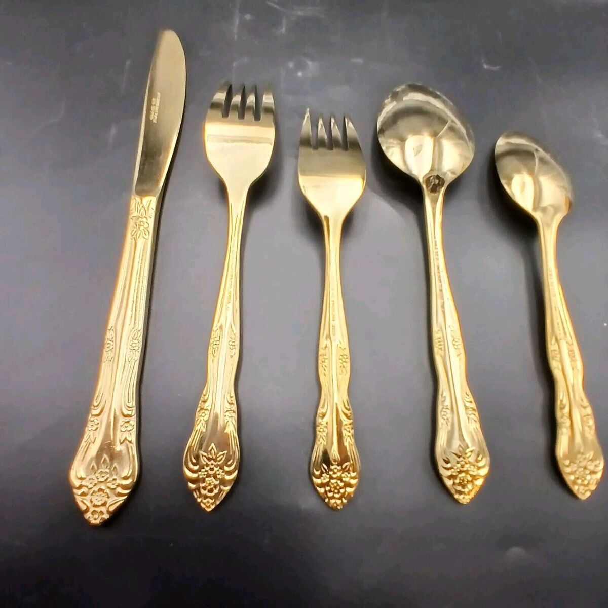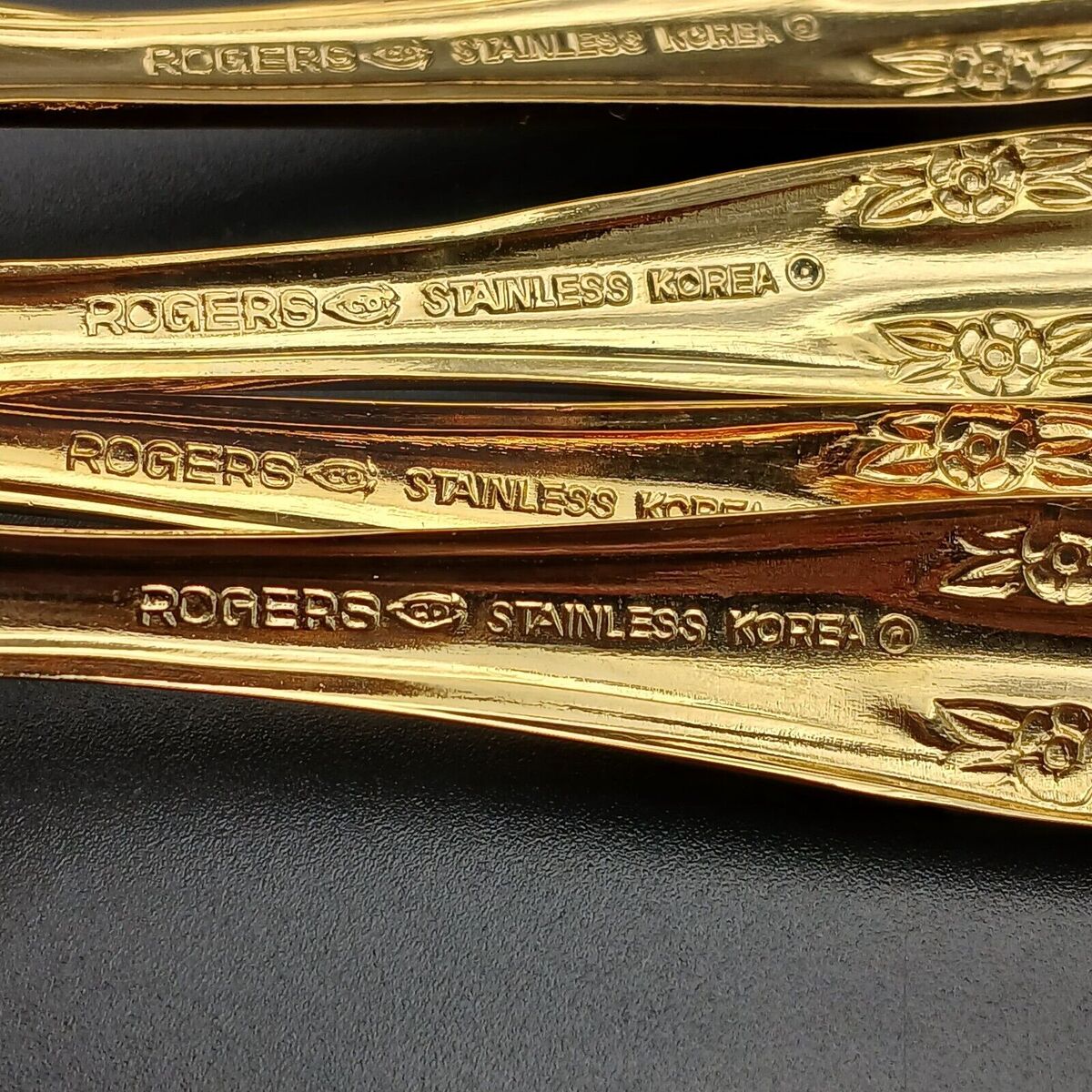 Elevate your dining experience with this vintage ROGERS Golden Dream Rose 20-piece flatware set. The set includes a knife, fork, and spoon, each plated with glossy gold electroplate and featuring the elegant Golden Dream Rose pattern. These pieces are perfect for serving at a dinner party or adding a touch of sophistication to your everyday meals.