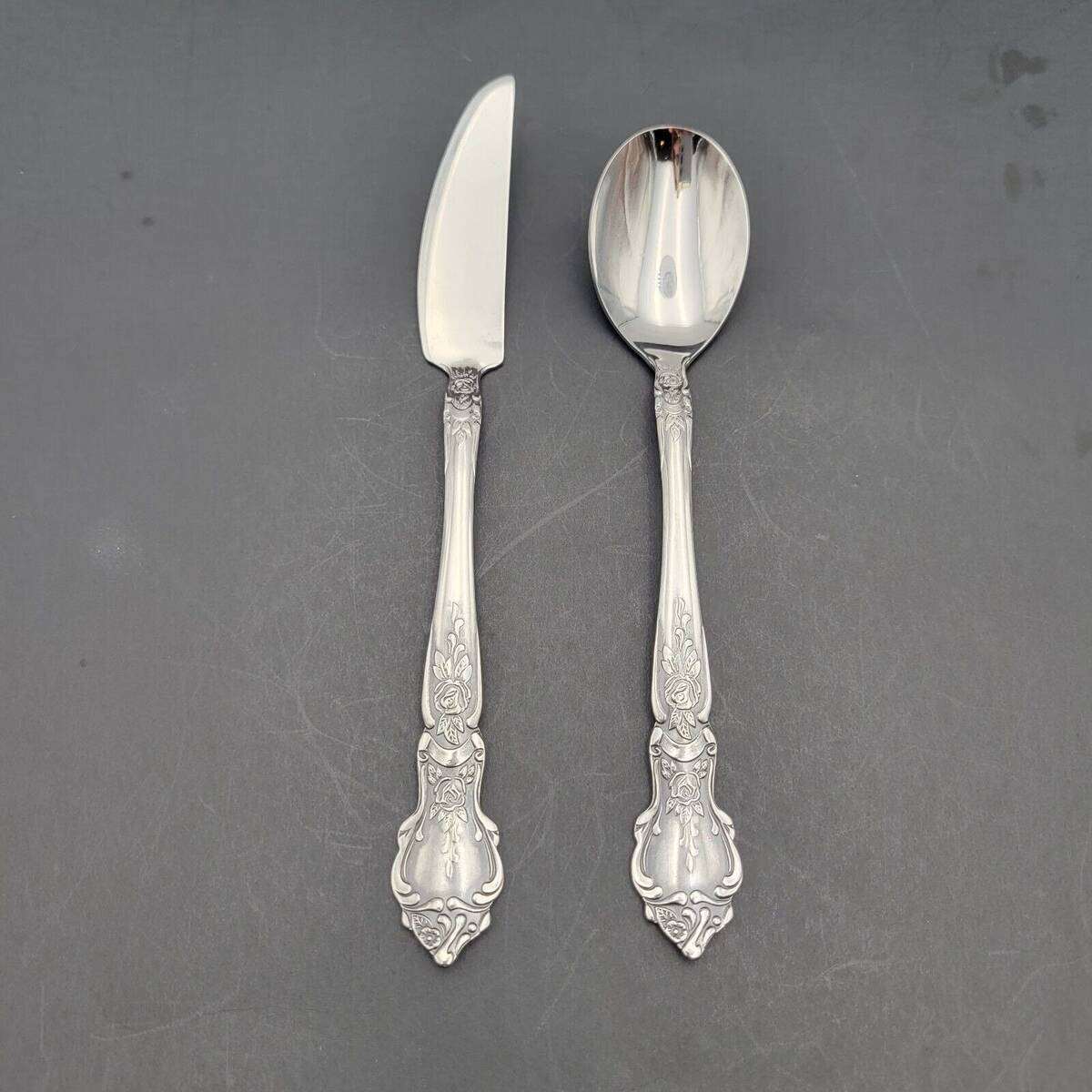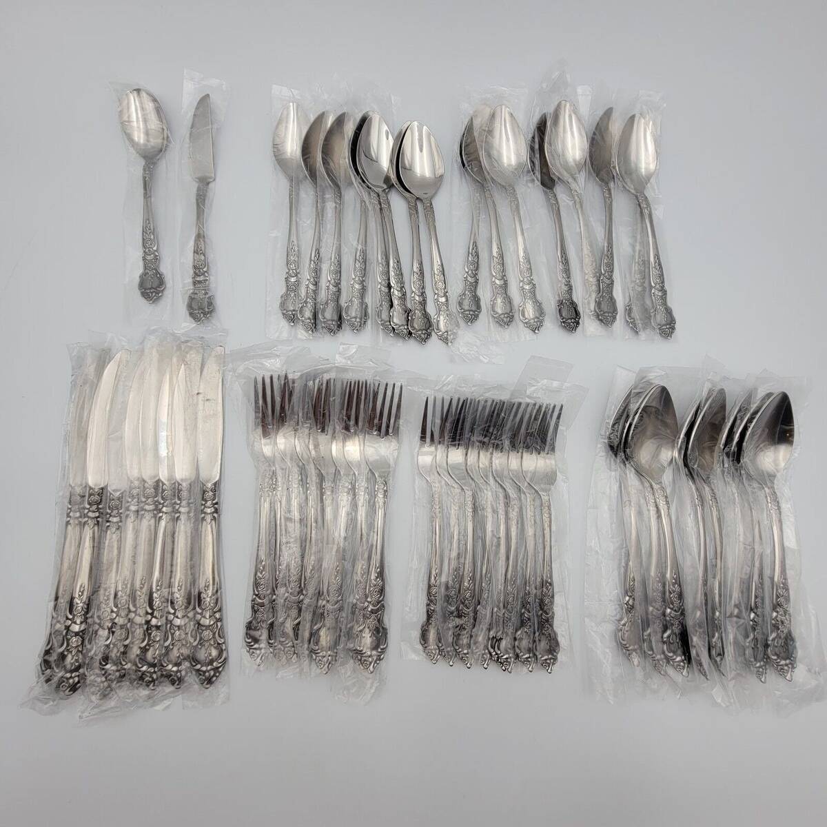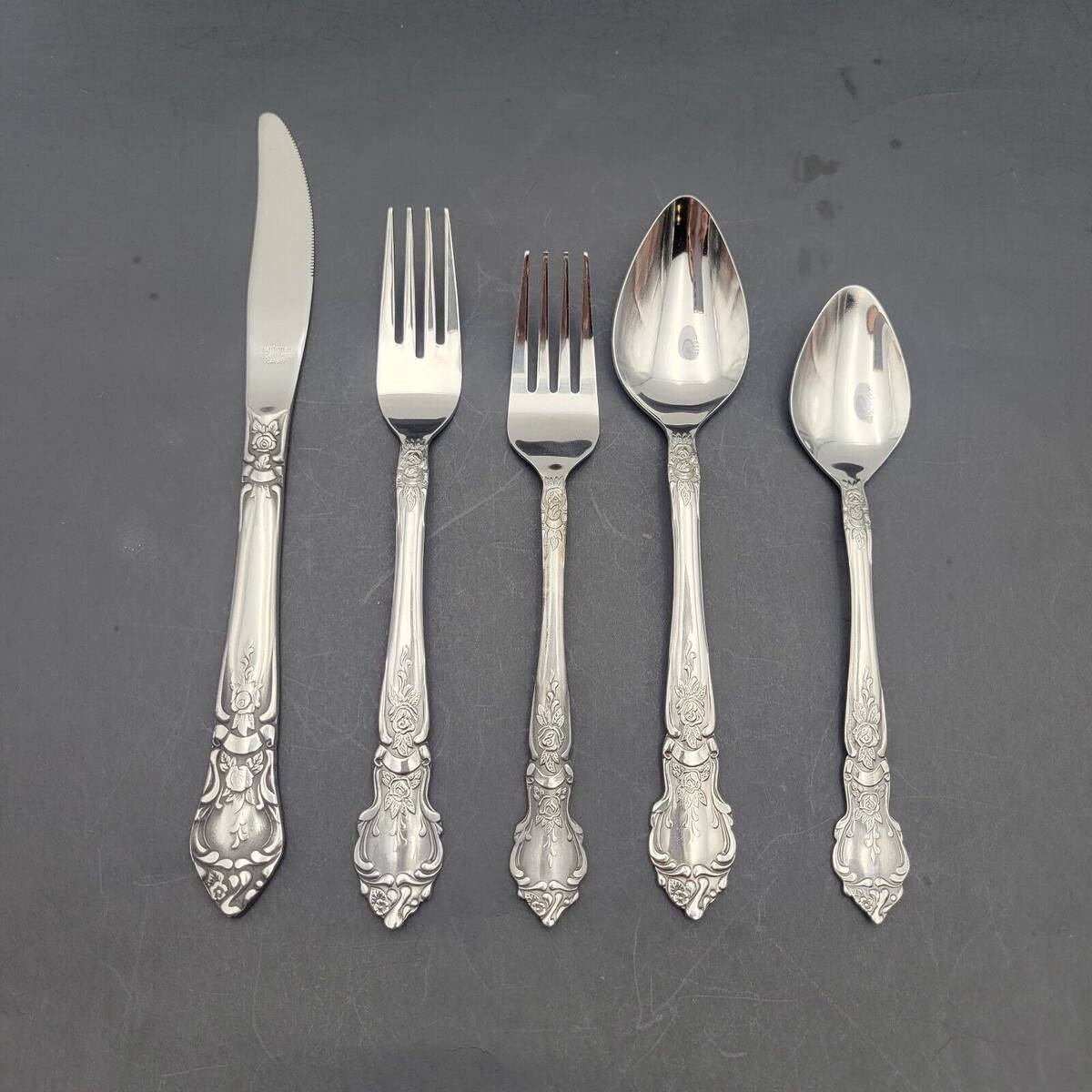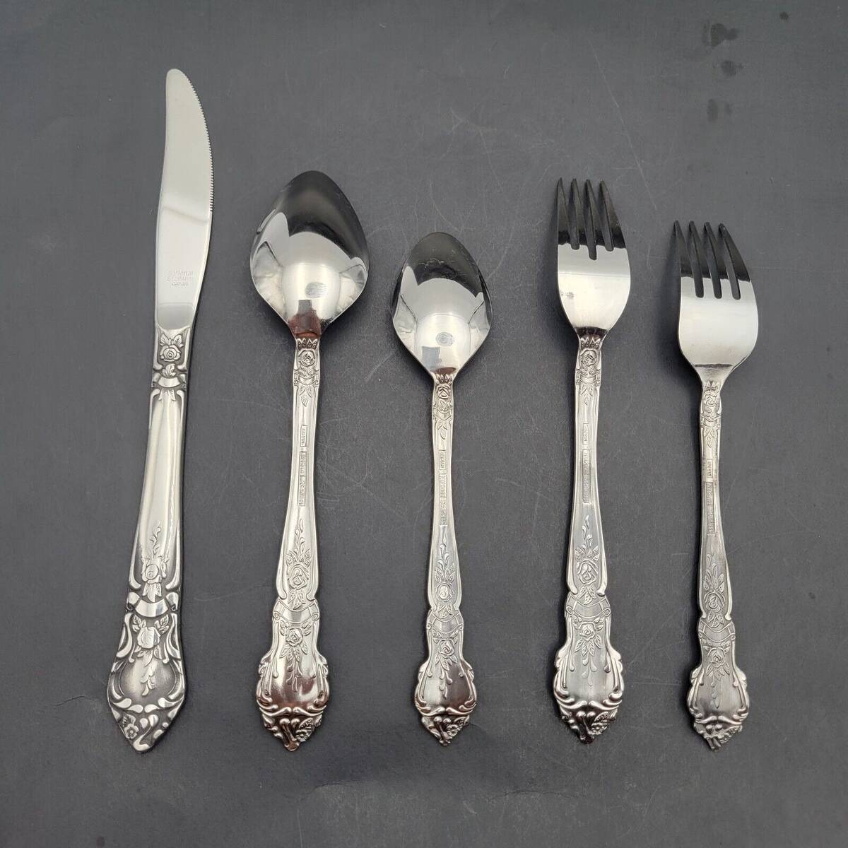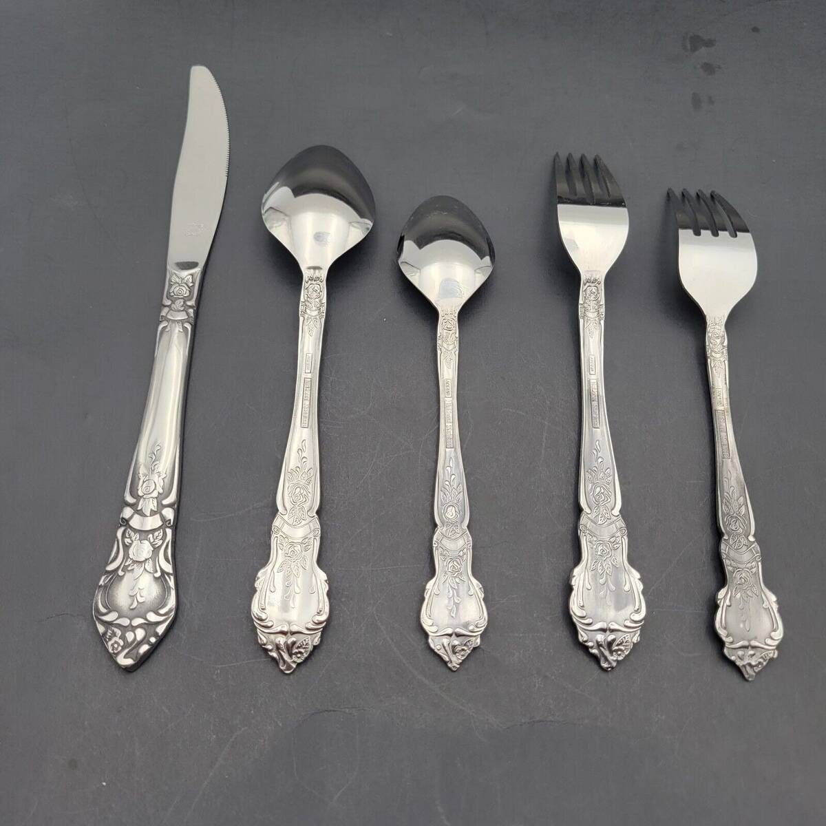 This vintage set of 50 pieces from NS National Stainless Japan features a charming rose and leaf handle pattern on each piece, including knives, forks, spoons, and teaspoon sets. The set is perfect for any occasion, from everyday meals to special occasions, and can be used by teens, boys, girls, adults, and kids alike.