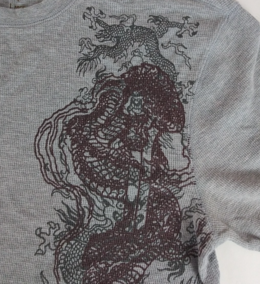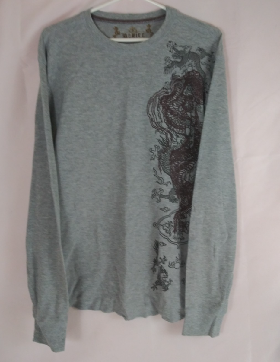 This is for a Rewire Men's Gray Pullover Long Sleeve Sword Dragon Design Shirt Size Large.
