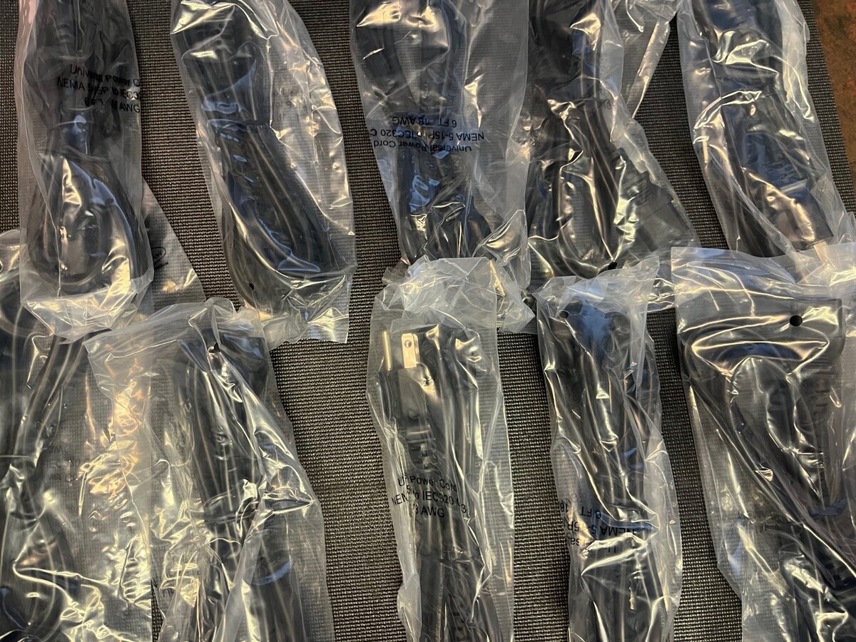 Lot of ten brand new 6ft universal power cords, NEMA 5-15P (standard US plug) to IEC320C13 (computer/monitor/device socket), 18 AWG black jacket. Ideal for computers, printers, monitors, and other electronics needing reliable cord replacements. UL/cUL listed, RoHS compliant, safe for home or office setup.