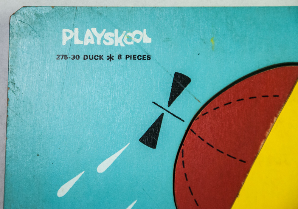 Vintage Playskool 8-piece wooden puzzle featuring a yellow duck in the rain, 275-30. Date of manufacture uncertain, but perhaps early 1960s. The puzzle tray measures 11-1/2" x 9-3/8" x 1/4" thick. Very good, used condition. Complete.