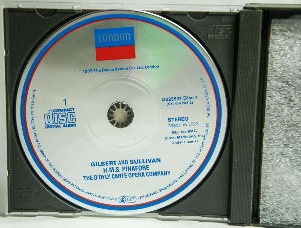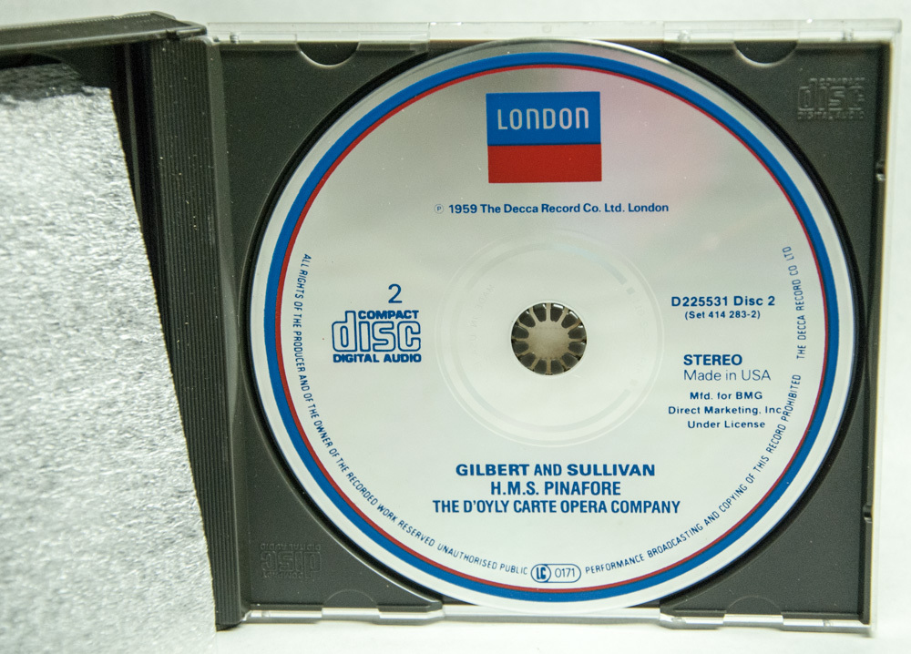 H.M.S. Pinafore by Gilbert Sullivan, performed by The D'Oyly Carte Opera Company with The New Symphony Orchestra of London. 1989 The Decca Record Company Limited, London. This is a 2-CD set in original case. CDs are in very good condition, case has some scuffs.