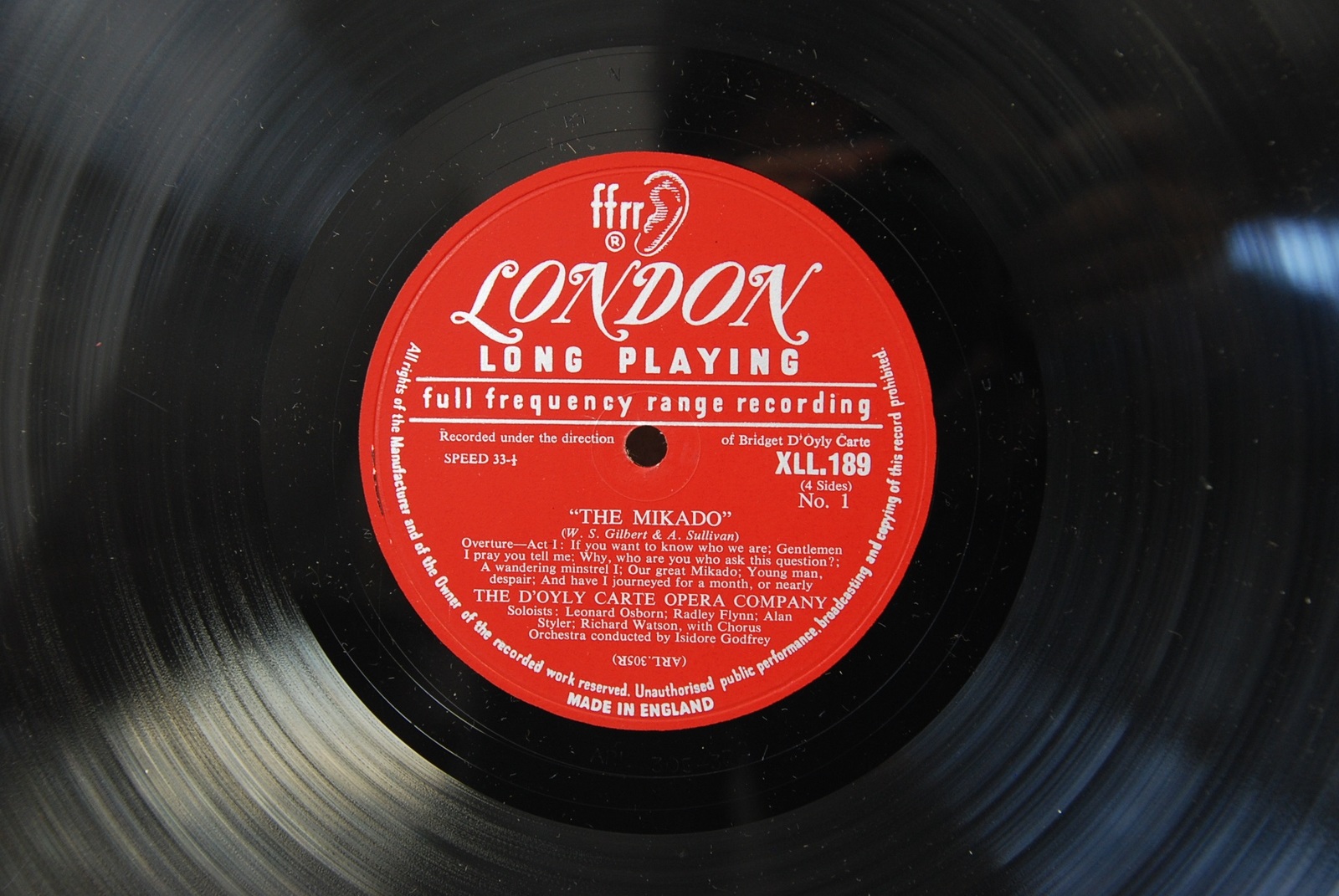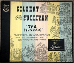 Gilbert and Sullivan "The Mikado", The D'oyly Carte Opera Company with the new Promenade Orchestra conducted by Isidore Godfrey, London ffrr, 2 LP boxed set, with Libretto. High fidelity records are lightly used and are in excellent condition. The box lid has separated from the bottom. Box is still in very good condition.