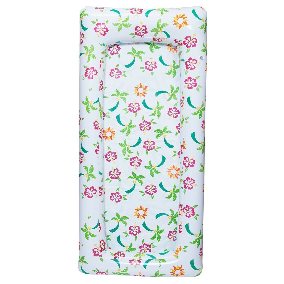 Tropical Print Buffet Cooler Inflate. Has Palm Trees, Hibiscus Flowers, and Suns printed all over. Approx. Size: 24" W x 4'6" L. Just over 4 foot long. Use as a self serve cold bar on top of a long table. Cute Picnic, Luau Cooler or Decor for a Summer Beach or Pool Party. Can be filled with ice and used to keep food and drinks cold or used as a decoration. Cute way to collect tickets for a drawing or use with part of a party game. Fill with snacks or party favors. Many uses.