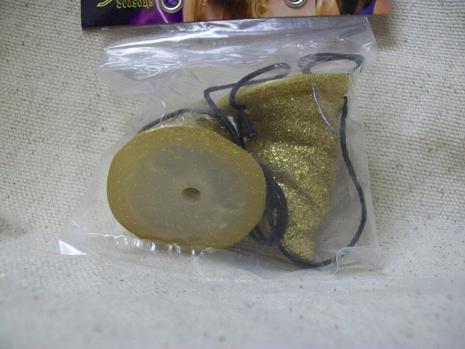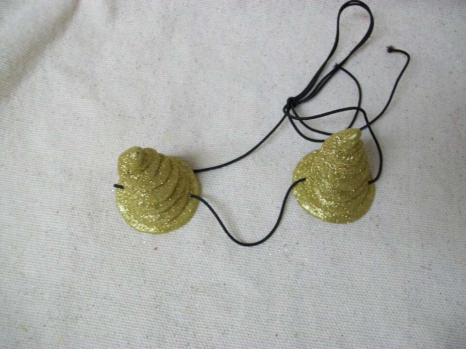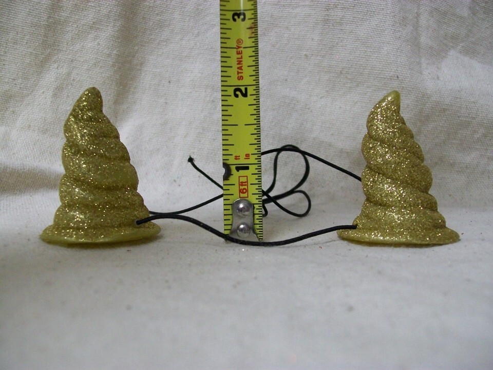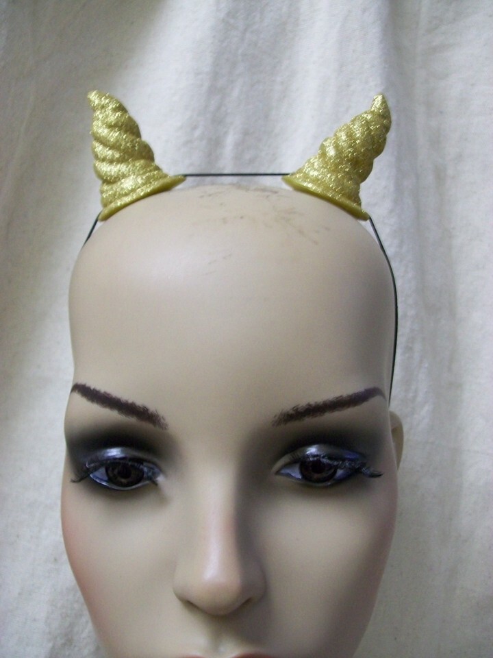 Miniature Spiral Costume Horns. Gold Gliitery Horns. Glitter does sheds. Light Weight. Has an elastic string that can be tied up to adjust for different size noggins. For ages 8 and up. Unisex. DOES NOT INCLUDE MANNEQUIN HEAD. Approx. measurements in the photos.