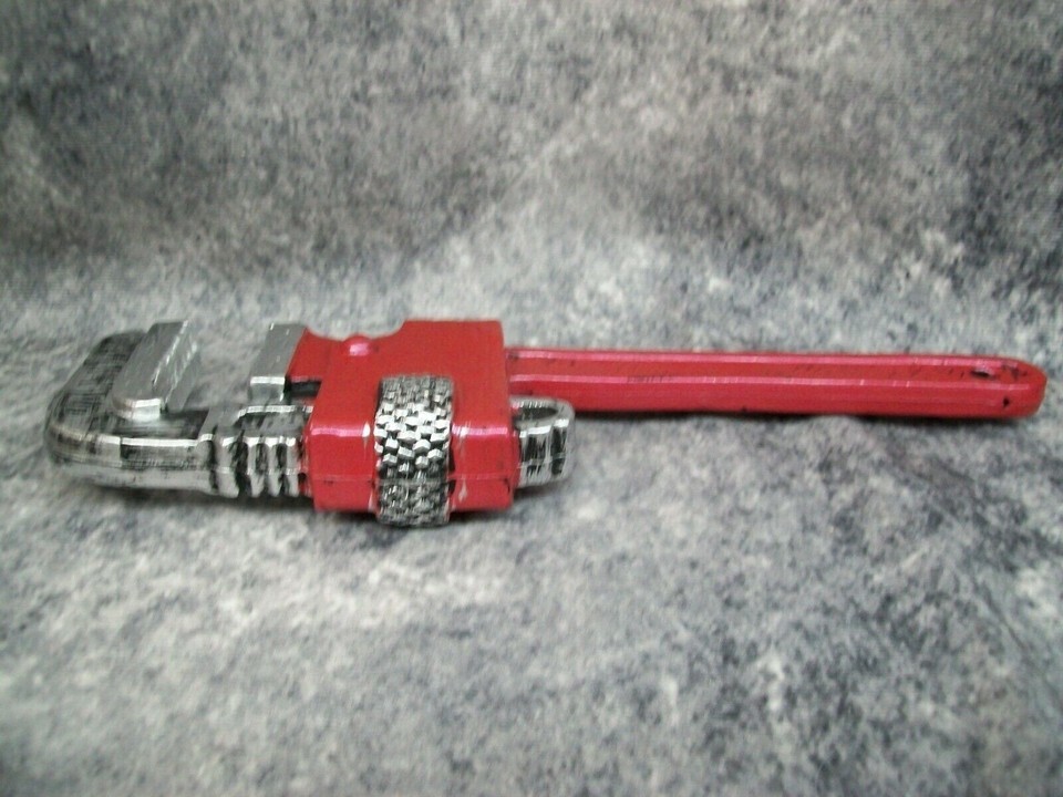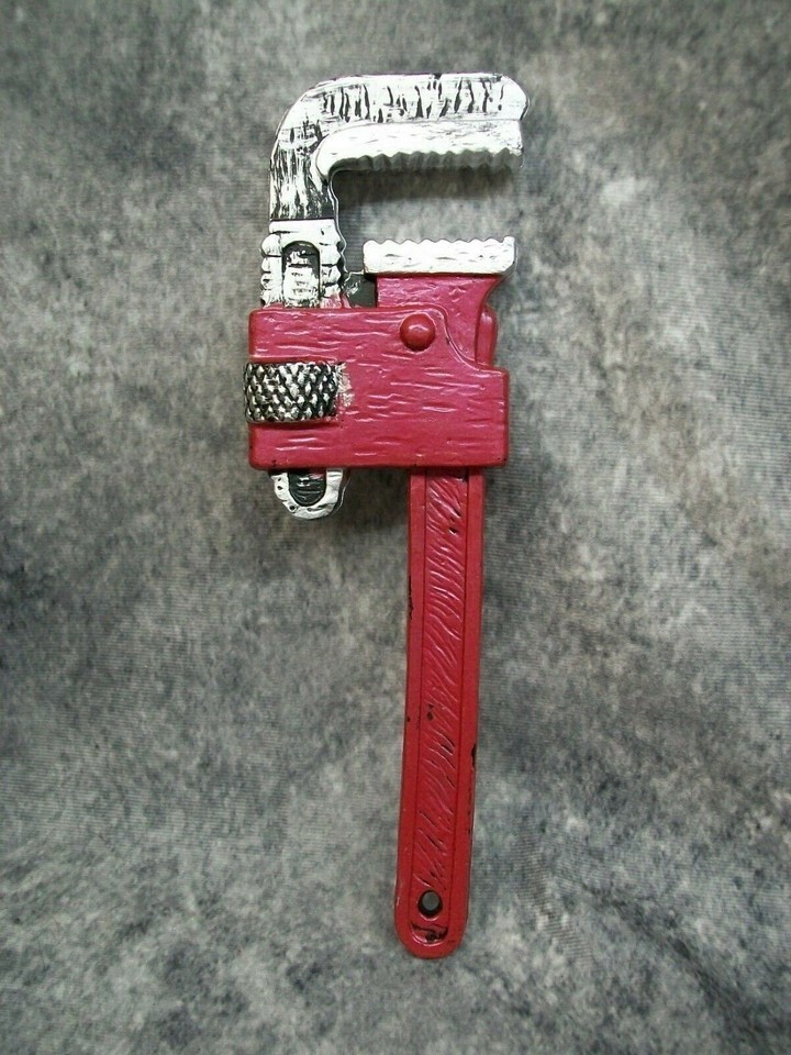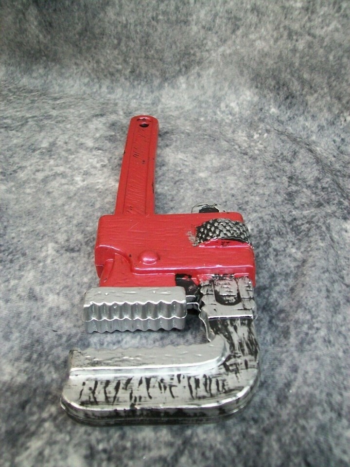 Small Fake Pipe Wrench Costume Accessory or Prop. Haunted Halloween Prop or Costume Accessory. Great to use as a Plumber, Mechanic, Mario Bros. or the Three Stooges costume accessory, party decoration, or haunted house or Garage, Tool Workshop, or Dungeon prop. Made of Lightweight Molded Hollow Plastic. Good Detail. No age specs. Tag says "Small parts. Keep away from children". Some Scuffs or Chips in paint. SOLD AS IS.