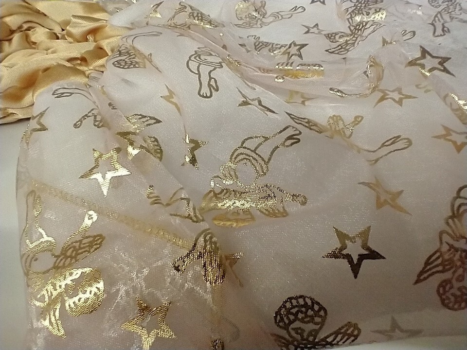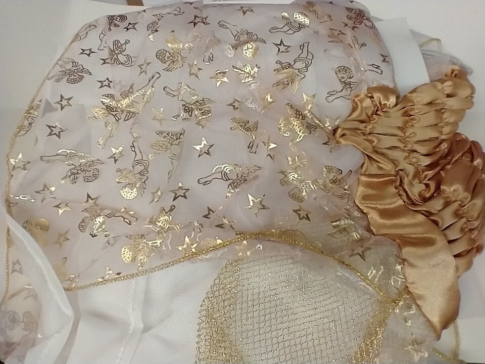 trumpeting cherubs / angels on it. Wings are sheer fabric with gold wrapped top