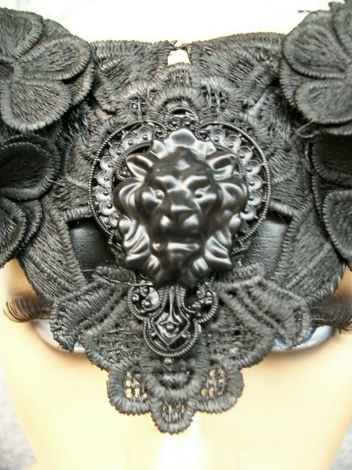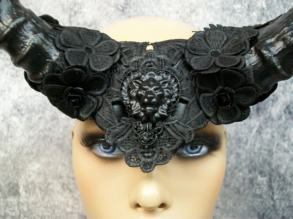 Gothic Black Horned Goddess Headpiece. Lion Adornment in front center. Horns are approx. 17.5" wide at the widest point. Some slight visible glue around the adornments. Can be worn like a circlet or a headband. Nice detail. Horns feel like plastic. Elastic on backside. One Size Fits Most. Not For ages under 12. DOES NOT INCLUDE MANNEQUIN.