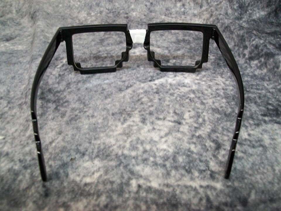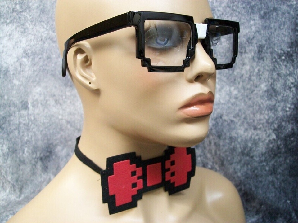 3 Piece Pixel Themed Costume Kit. Glasses have thicker black frames with a piece of white tape in the center and clear lens. Bowtie is Red over a stiff black felt like material. Has black elastic straps with velcro style tabs on the ends. Bowtie is Adjustable. White plastic pocket protector. Has print on the flap and the rest is plain. Unisex. For Ages 14 and up.