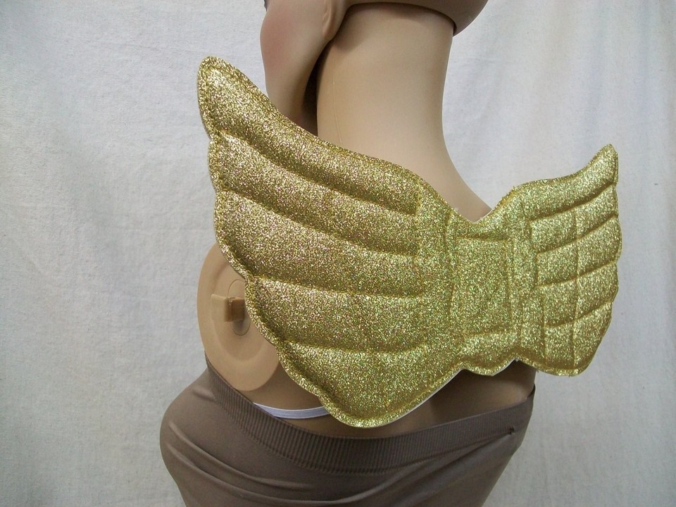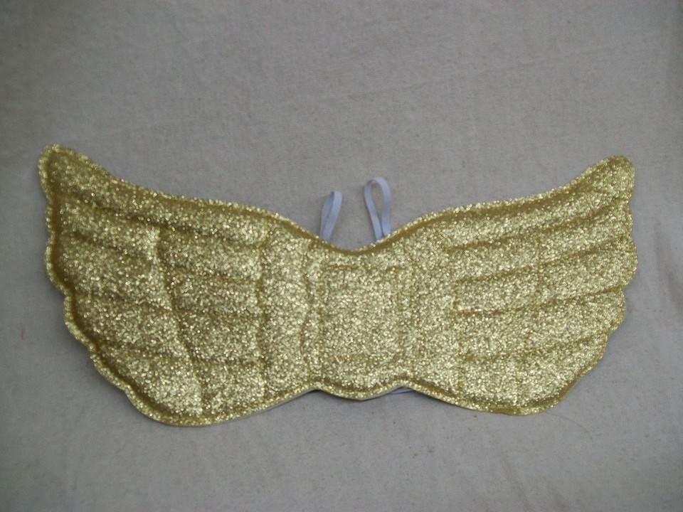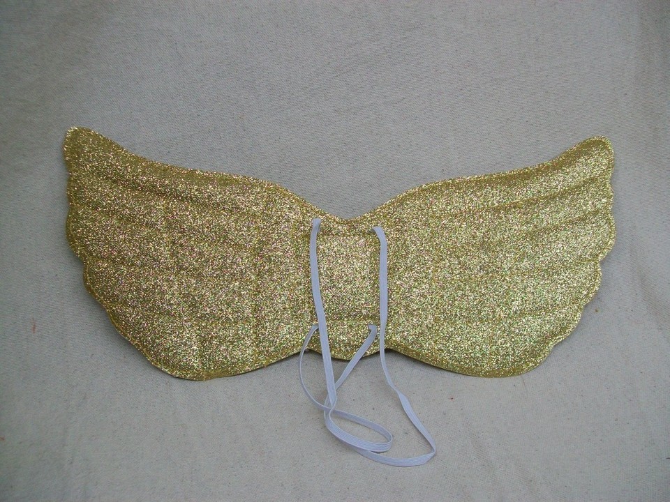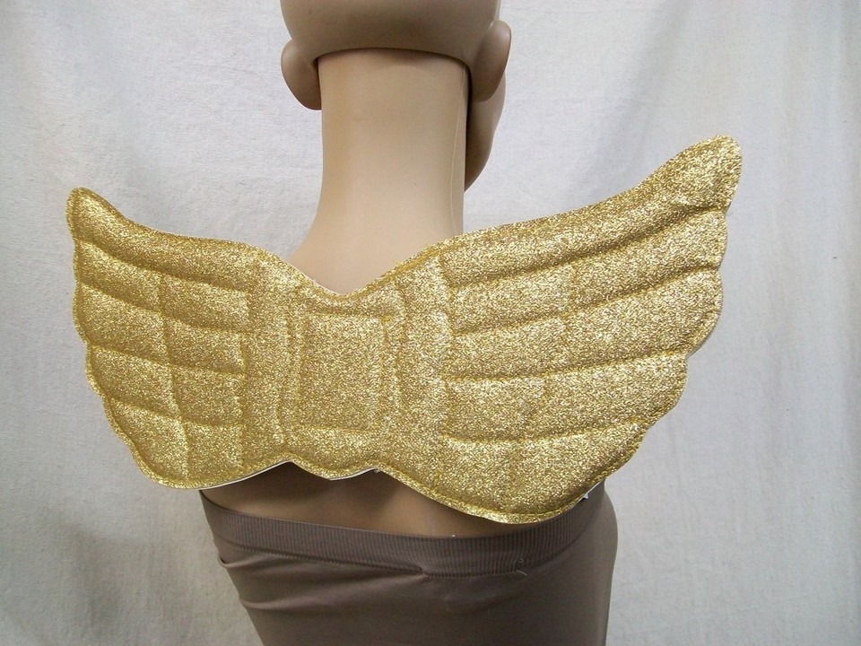 Mini Glittery Gold Costume Wings, Wings have attached elastic shoulder straps. One Size Fits Most Adults. The glitter will shed. Great for a Halloween costume, school play or pretend.