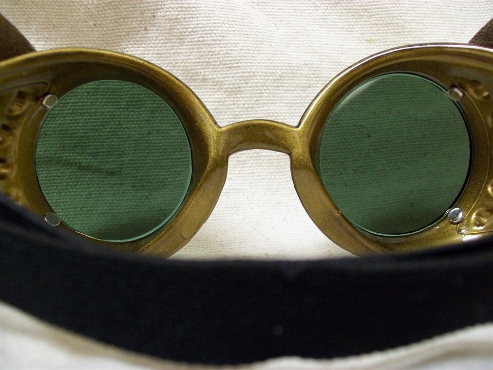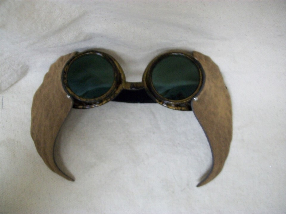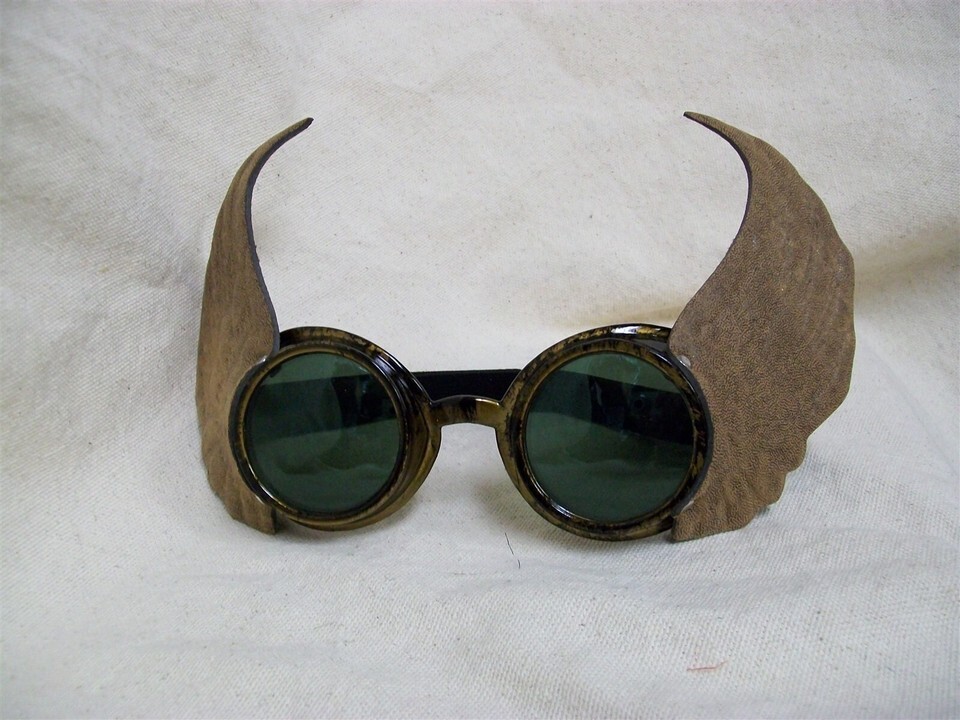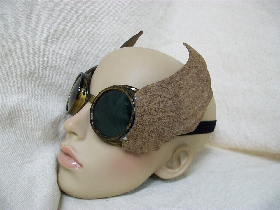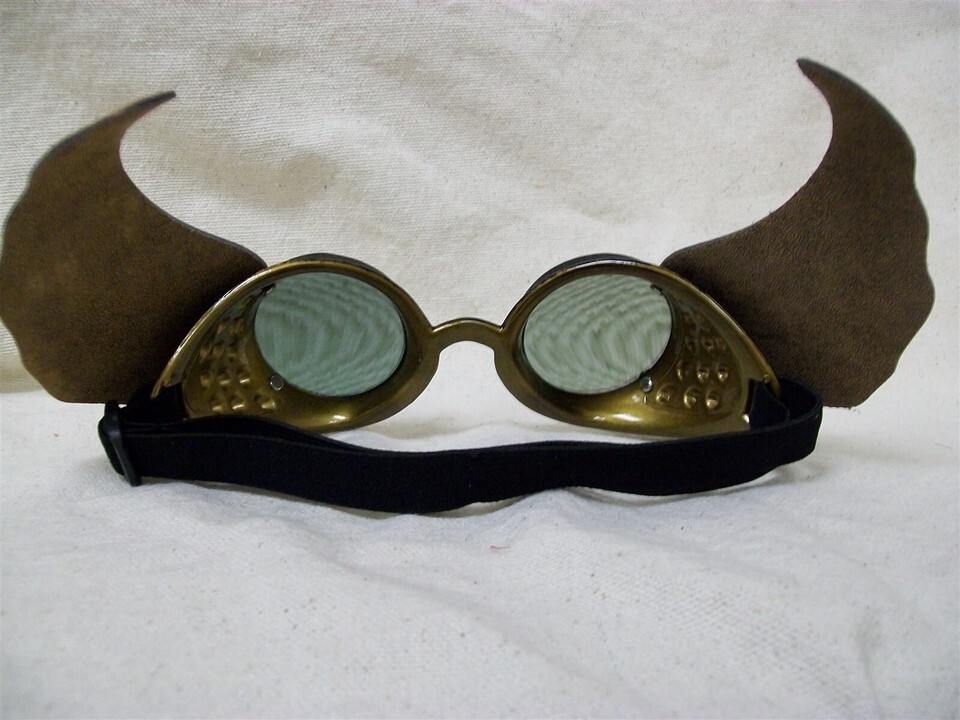 Winged Costume Goggles. Gold Brushed Frame. Greenish Tinted Lens. Has a black adjustable band in the back with attached brown tone wings. One wing on each side. Can be worn as goggles, around top of head, over a hat as a hat band. Nice Goggles. DOES NOT INCLUDE MANNEQUIN.