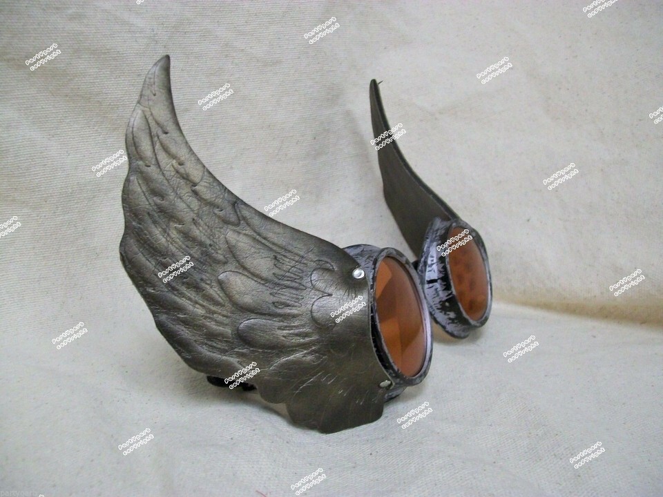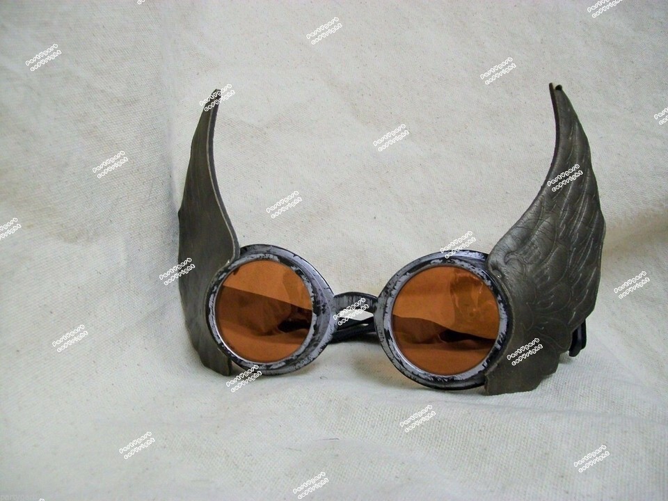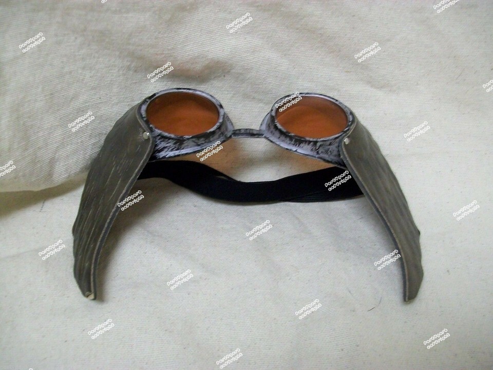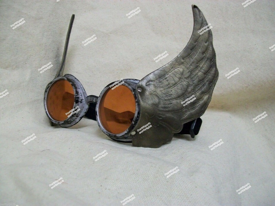 Winged Costume Goggles. Black Frame with Silver Brushed Marks. Amber like Tinted Lens. Has a black adjustable band in the back with attached bronze tone wings. One wing on each side. Can be worn as goggles, around top of head, over a hat as a hat band. Nice Goggles. DOES NOT INCLUDE MANNEQUIN OR A HAT.
