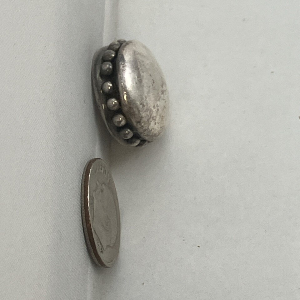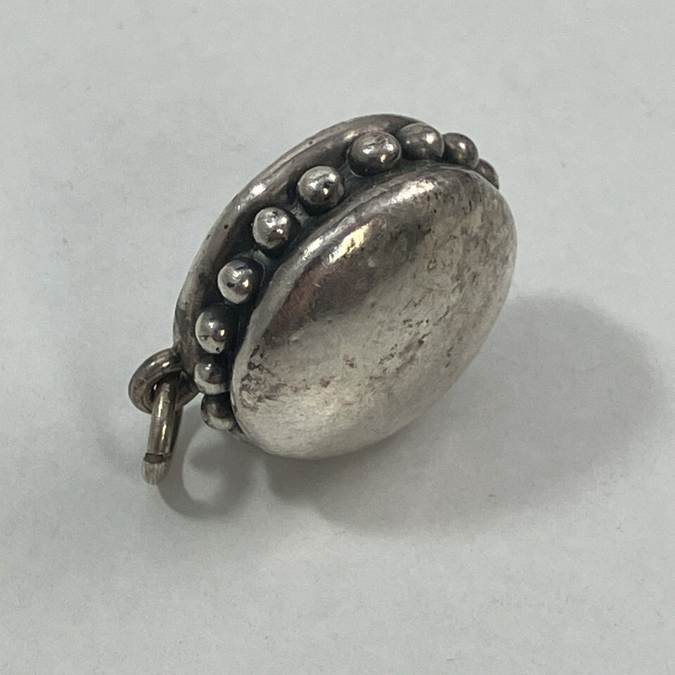 Interesting find in a bag of mixed jewelry. We think it may have been an earring but was found in a broken bracelet as more of a charm. We think it looks like a hamburger but more likely just an Art Deco or Modern design. Marked SSD 925 on back which means Simon Sebbag Designs and 925 for silver purity (Sterling) - something this maker used quite a bit.