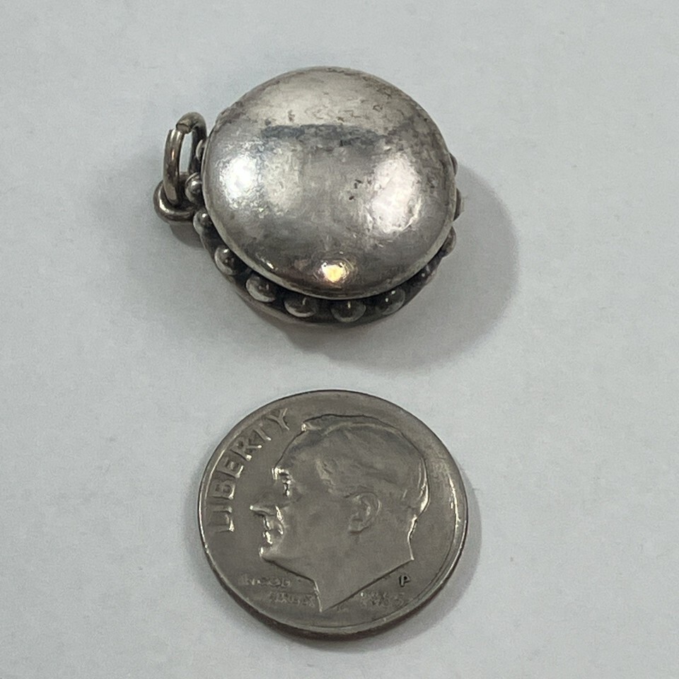 Charm or pendant (or formerly earring) is about the size of a dime but much thicker.
