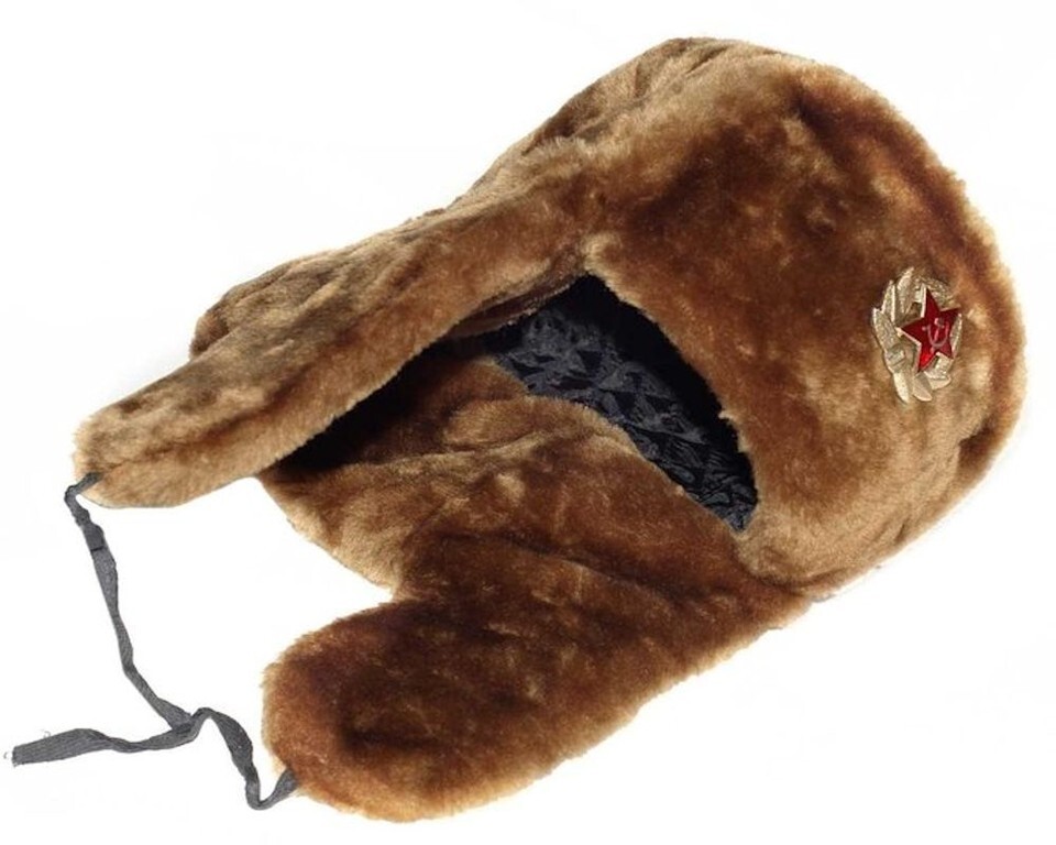 Ce chapeau en fourrure de couleur marron camel avec oreillettes est un chapeau d'hiver traditionnel de l'armee sovietique - chaud et confortable, parfait pour se proteger des vents siberiens et des tempetes de neige. Il est fait de fausse fourrure. Ce type de fourrure a ete concu en Union sovietique specifiquement pour de tels chapeaux d'armee d'hiver. Il est connu pour sa durabilite et sa resistance a la neige et a l'eau. Ce modele est disponible dans les tailles M, L et XL. Il a une belle doublure matelassee. Chaque chapeau est fourni avec un insigne sovietique detachable d'aigle a deux tetes. En cas de besoin, l'ecusson se detache facilement sans laisser de traces sur la fourrure. Ils peuvent etre portes cache-oreilles vers le haut ou vers le bas. Les materiaux utilises sont 37% pan, 30