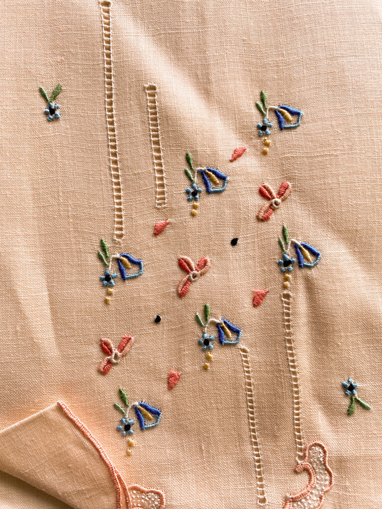 Vintage Madeira linen Pastel Hand Embroidered FingerTip Towels -a pair, one peachy pink, one blue. Exquisite embroidery and drawnwork. Made in Portugal.They have a couple pinholes in the middle from a tag someone put on it.