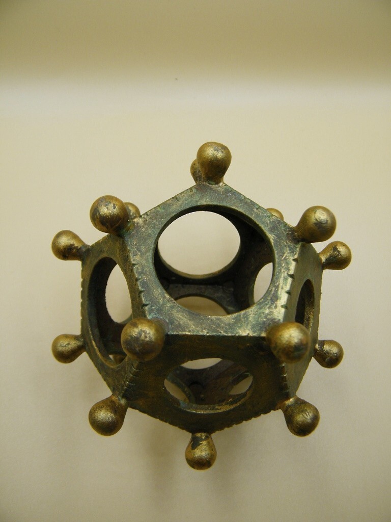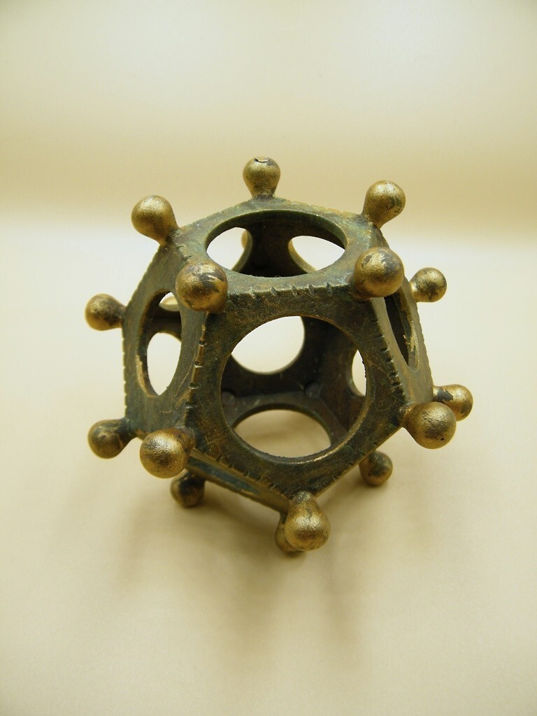 A Roman dodecahedron or Gallo-Roman dodecahedron is a small hollow object made of copper alloy which has been cast into a regular dodecahedral shape: twelve flat pentagonal faces, each face having a circular hole of varying diameter in the middle, the holes connecting to the hollow center. Roman dodecahedra date from the 2nd to 4th centuries AD.