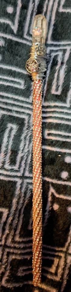 This product is a unique and elegant Rhinestone Magic Wand designed for pet lovers and groomers. Made in the United States, it features a raw quartz point, adding a touch of natural beauty to its appearance. The wand combines the healing properties of crystals with the magic of metaphysical energy, making it a special tool for those who care for pets and are interested in alternative healing practices. It can be used for various purposes, such as promoting relaxation, aiding in grooming rituals, or creating a peaceful environment for pets.
