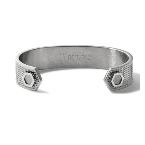 The model J96B007 Bulova men's open cuff stainless steel bracelet features signature Bulova Precisionist collection bolt details and a knurled texture.