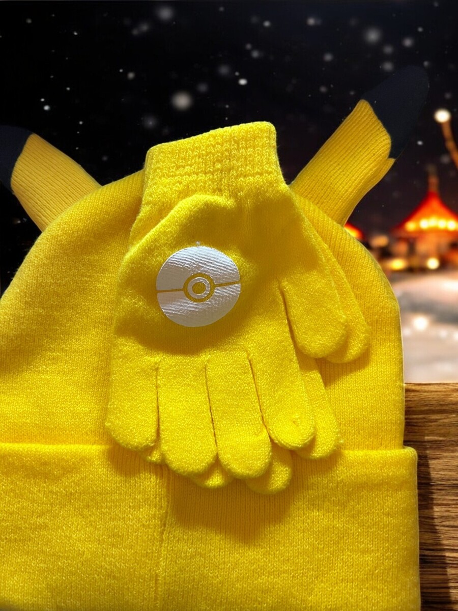 Pokemon Pikachu Beanie & Gloves Set – Yellow Hat with Ears and Pokeball Gloves