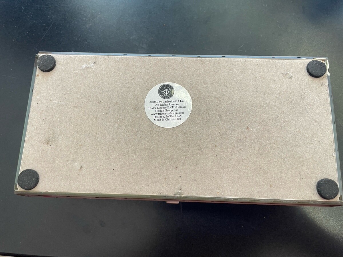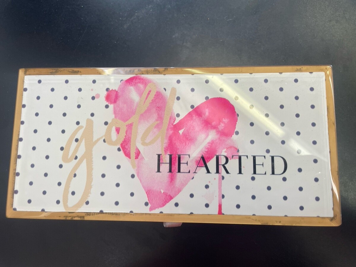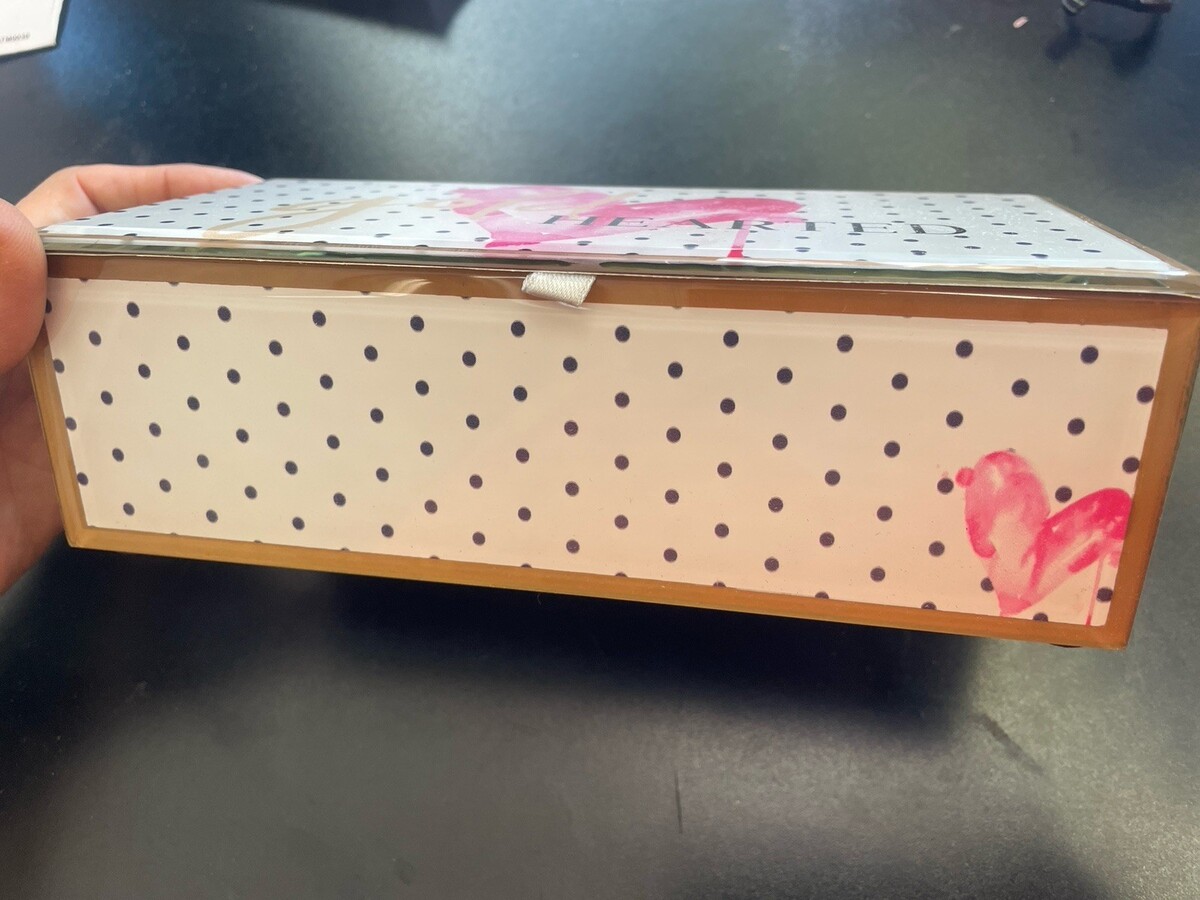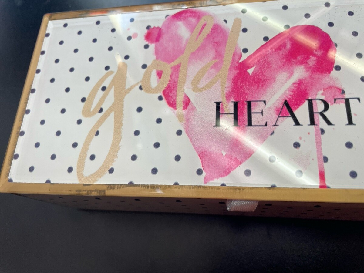 Rectangular Jewelry Box Golden Edge Glass Cover GOLD HEARTE Polka Dot Pink Heart. Condition is Pre-owned. Shipped with USPS Ground Advantage. It is 7.75x 4.75x2.75 dimensions from outside .