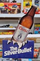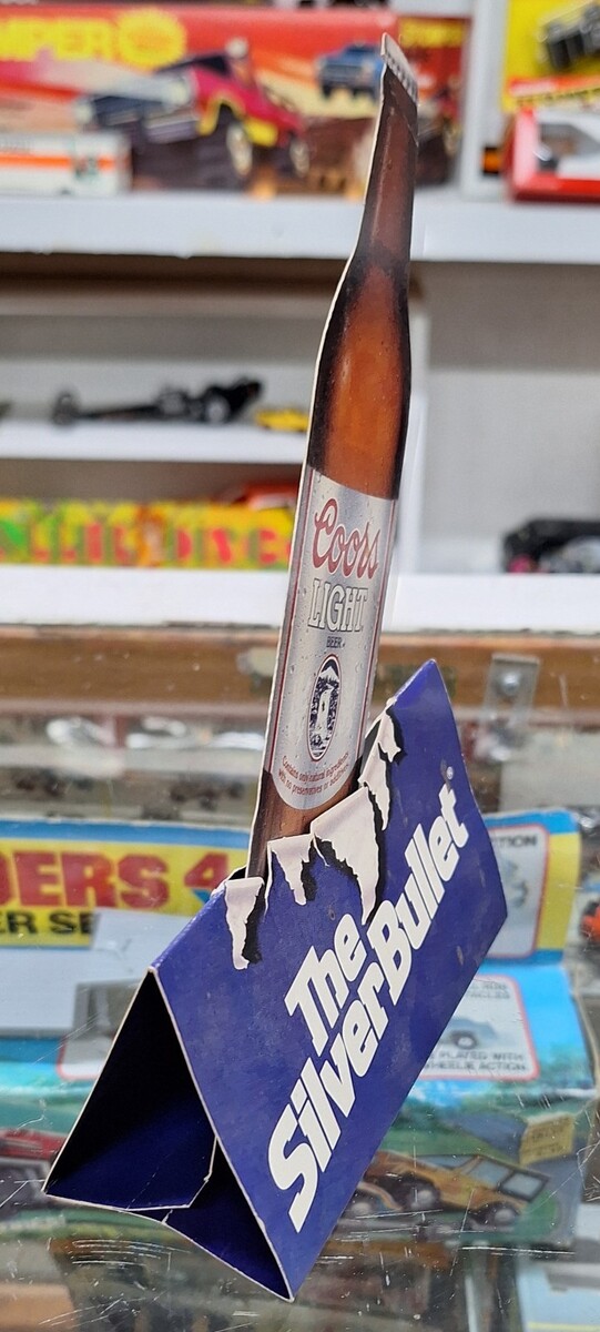 The COORS Light Beer Silver Bullet Bar Top Display is a collectible poster featuring the Coors brand, showcasing a theme of breweriana. This unique display originates from the United States and is not a modified item. Perfect for beer enthusiasts and collectors, this bar top display adds a touch of Americana and nostalgia to any home bar or man cave.
