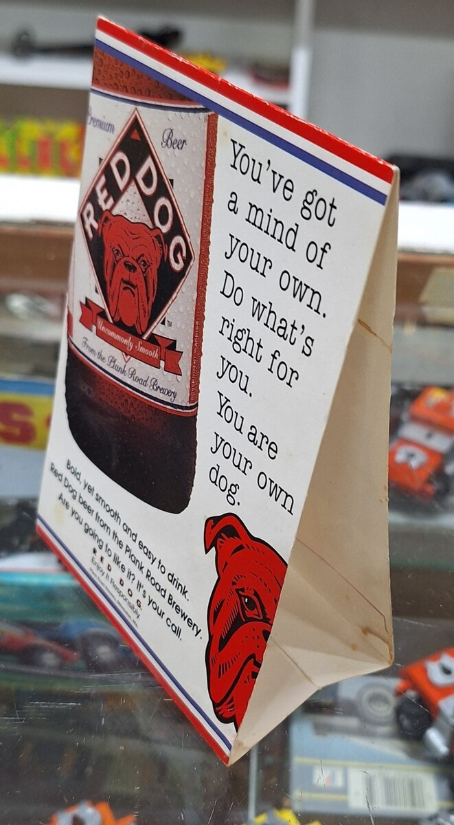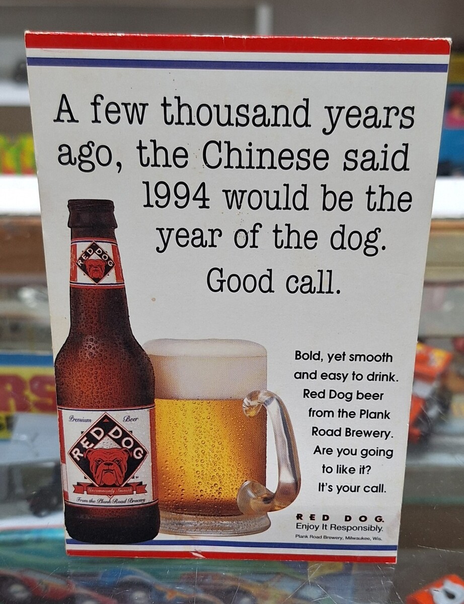 The product is a vintage 1994 Red Dog beer bar top display poster featuring the Red Dog brand. This collectible piece of breweriana was created in the United States and has not been modified. Perfect for beer enthusiasts and collectors alike, this poster showcases the iconic Red Dog beer in a stylish and nostalgic way, making it a great addition to any home bar or man cave. Cheers to the 1990s with this classic piece of beer memorabilia.