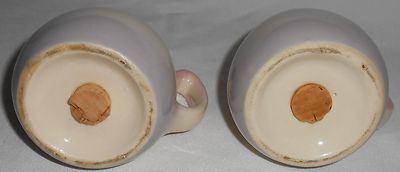 This is the Handled Range Top Salt and Pepper Set from the 1950s Hull Pottery Debonair Pattern with the Pink and Black colors...great color combination! They measures approx 3 1/4" tall and both are in good pre-owned condition with no chips or cracks - a glaze imperfection near handle of one shaker. Both have cork stoppers intact.