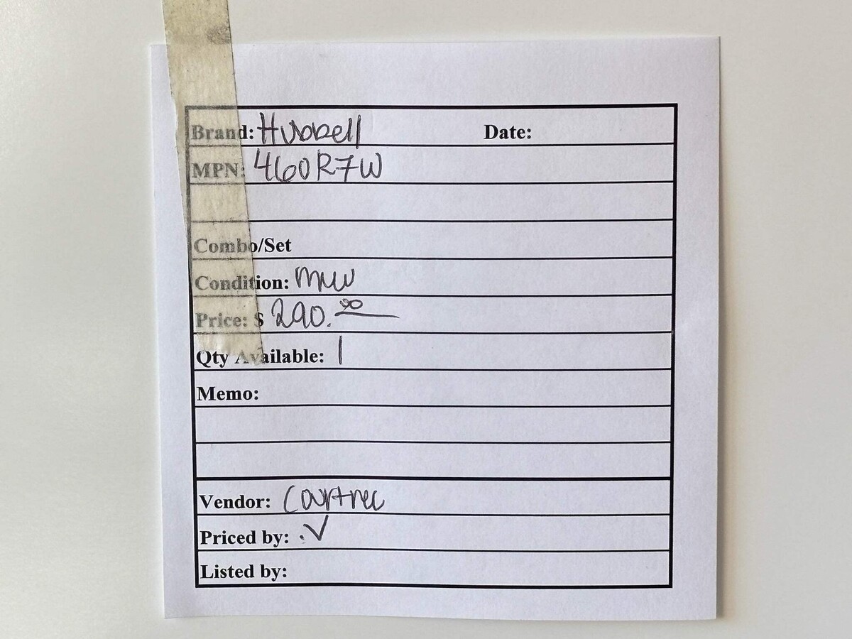 Hubbell HBL460R7W 60 A 480 V 3-Pole/4-Wire IEC Watertight Receptacle New No Box The HBL460R7W is a rugged industrial-grade female pin sleeve receptacle rated at 60 amps and 480 volts for 3-phase delta systems (3-pole, 4-wire grounding). It features a watertight design (IP67) with screw-terminals, non-metallic composite housing and self-closing gasketed cover, built to withstand harsh environments. Listed by: Maksim (Sales Team) ?Self-discipline is doing what?s right instead of doing what you feel like doing. That?s the meaning of self-disciple.?~ Eliud Kipchoge (A positive moment brought to you by Help Resale) About Us Welcome to Help Resale, your go-to consignment shop where value meets quality. At Help Resale, we're dedicated to providing you with an exceptional shopping experience, whether you're looking to find the best deals or consign your items. Need to buy a product, but don't see it in our store? Please feel free to reach out to us and we will help you find it! Help Resale 7200 Fair Oaks Blvd Suite 120 Carmichael CA 95608 Business Hours: Monday-Friday: 9:00 am to 5:00 pm (PST) All product and company names are trademarks TM or registered trademarks of their respective holders. Use of them does not imply any affiliation with or endorsement by them.
