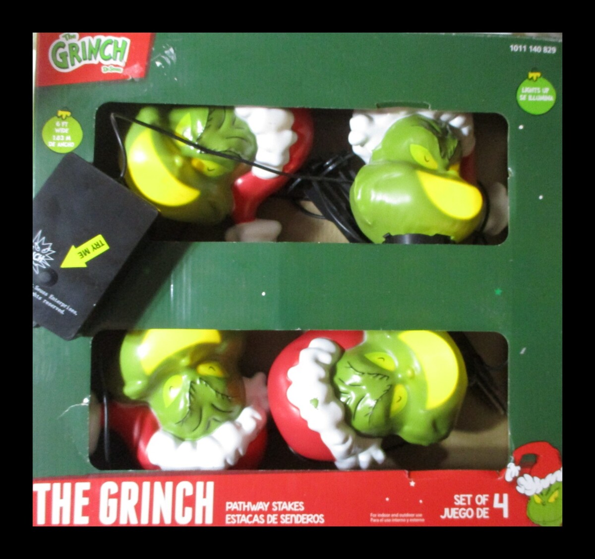Gemmy The Grinch with Santa Hat Dr Seuss Light Up Pathway Stakes Set of 4 6 Ft. Fully working. Used 3 AA batteries, included. Same or next day ship.