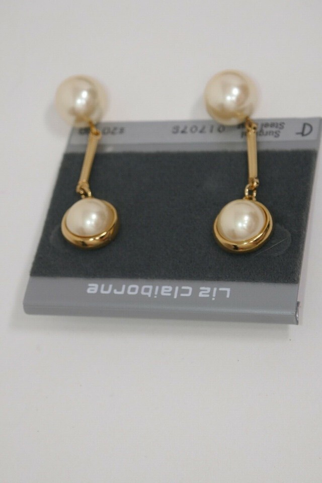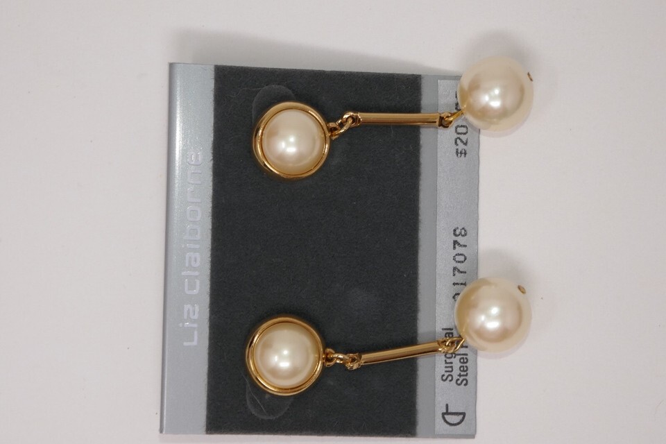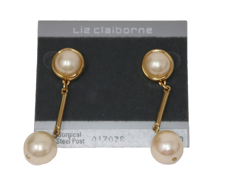 Up for sale is a pair of Liz Claiborne Gold Tone Faux Pearl Dangle Earrings. These measure approx. 2" long.